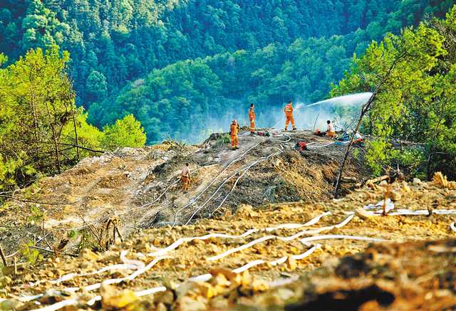 8月23日,巴南区界石镇新玉村所辖山林火灾南线隔离带现场,应急救援人员正在洒水润湿林木防止火线蔓延。记者 谢智强 摄/视觉重庆