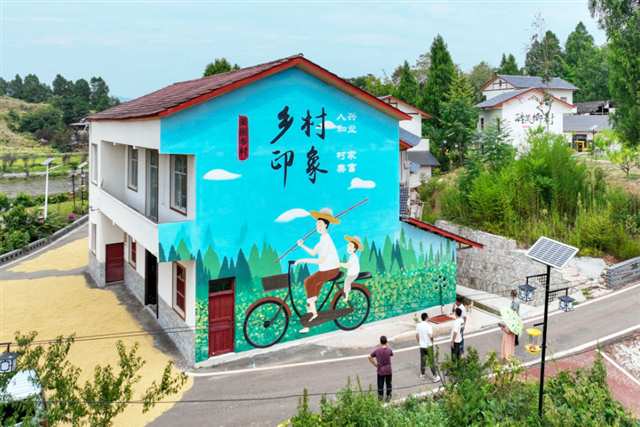 8月6日,游客在欣赏垫江县长龙镇长久村的墙绘。记者 张春晓 摄/视觉重庆