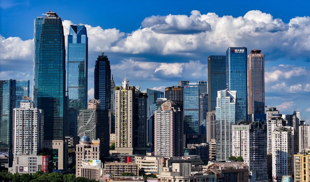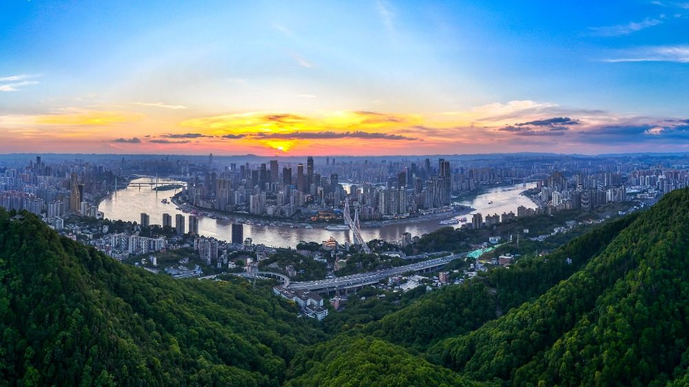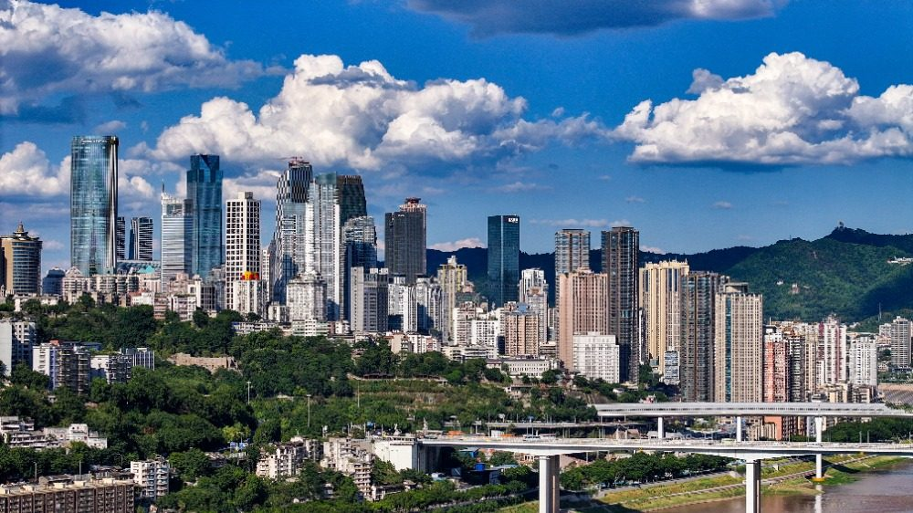 8月27日,蓝天白云下的重庆城区(无人机照片)。记者 尹诗语 摄