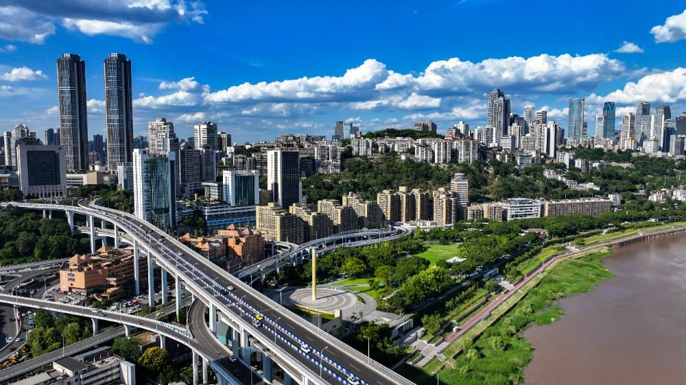连日来,重庆中心城区碧空如洗,湛蓝澄澈。朵朵白云轻盈游弋,与城市叠嶂的楼影相映成趣。
