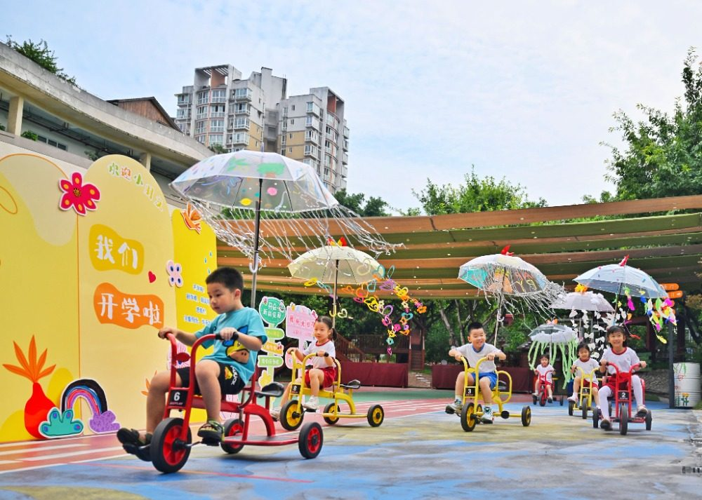 9月1日,北碚区缙云幼儿园,孩子们骑着小花车在园区玩耍。首席记者 龙帆 摄
