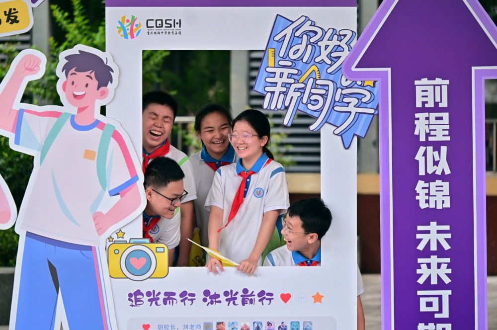 9月1日,重庆珊瑚中学(南坪步行街校区),同学们在学校布置的打卡台前互动,用轻松愉悦的心态迎接新学期。特约摄影 郭旭
