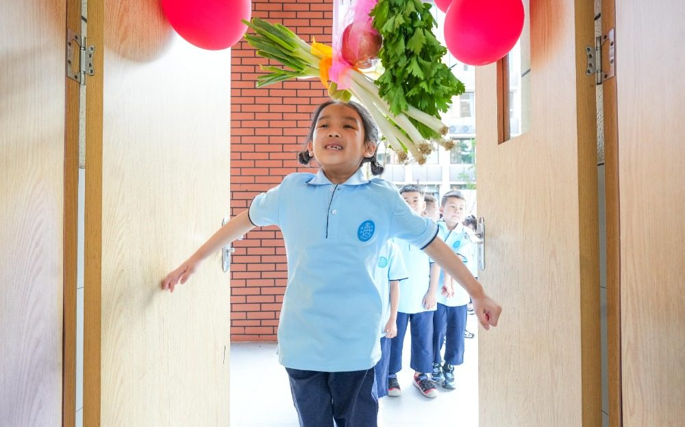 9月1日,垫江县垫江中学三合湖学校,一年级的学生跳着“顶大葱”进入教室。通讯员 兰楠 摄