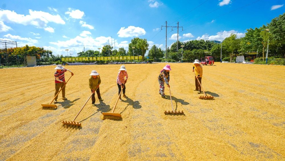2025年9月15日,垫江县新民镇恬园山庄,工人在晾晒水稻(无人机照片)。特约摄影 龚长浩