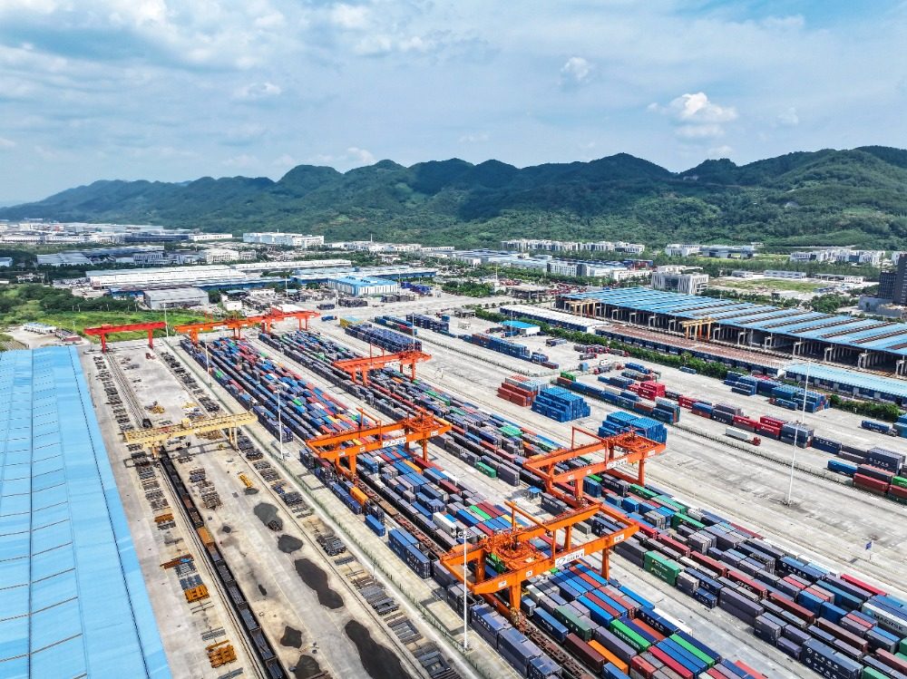 9月16日,位于沙坪坝区的团结村中心站龙门吊起降不停,每天至少4趟西部陆海新通道班列从这里发运(无人机照片)。通讯员 郭晋 摄
