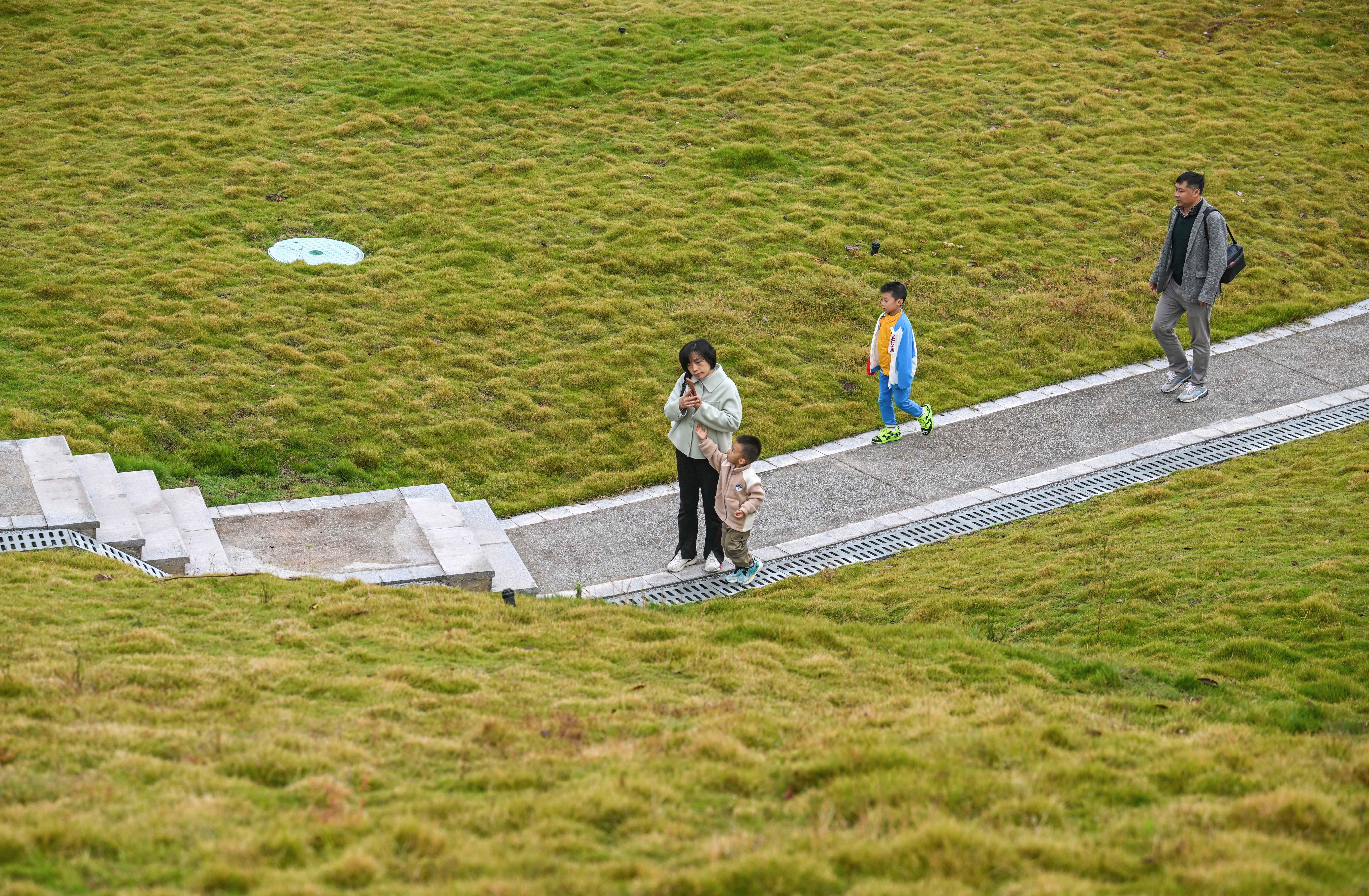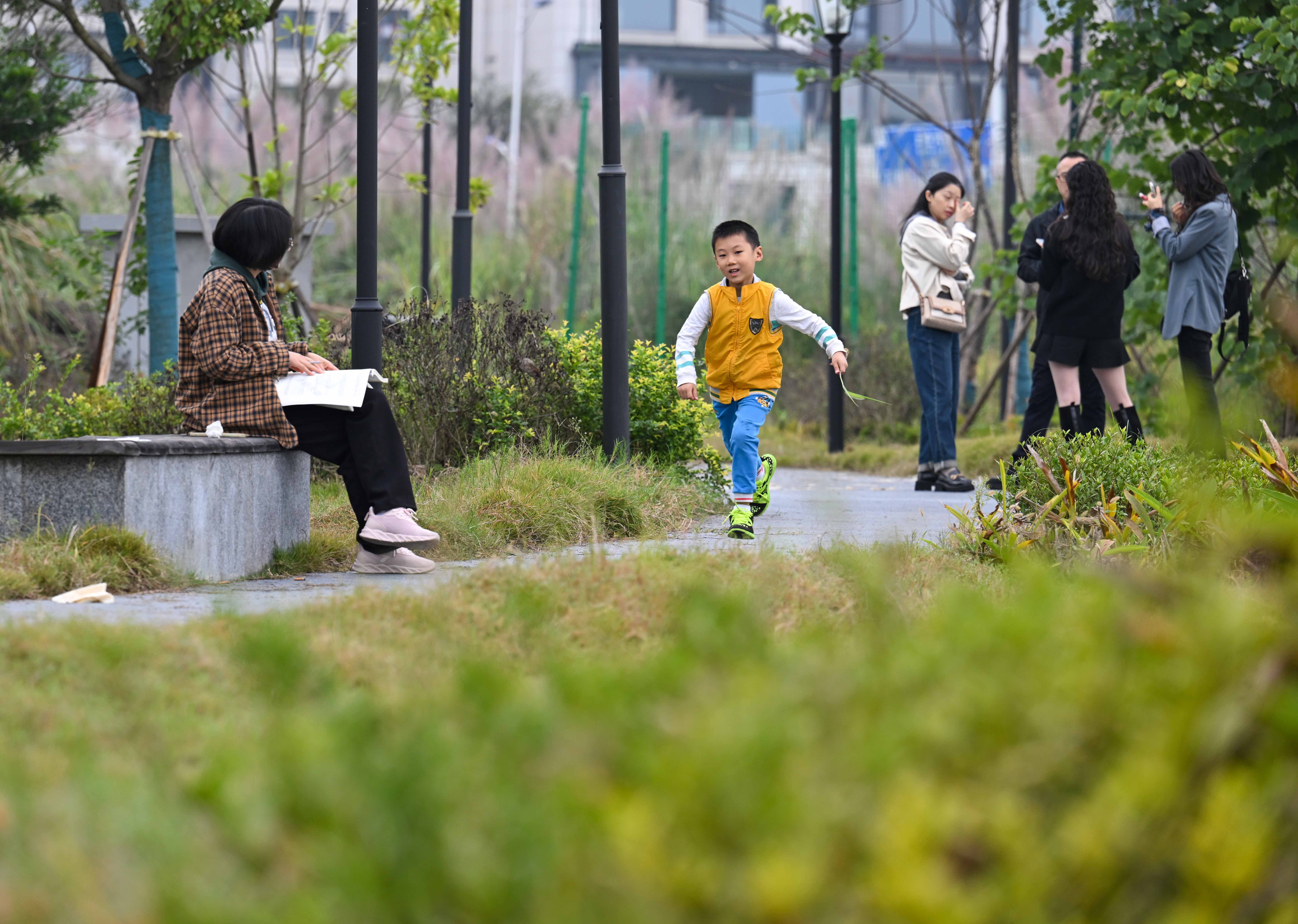 11月2日,两江新区水土新城复兴轨道站附近,市民走在口袋公园步道上。该项目景观面积约9320㎡。记者 张锦辉 摄
