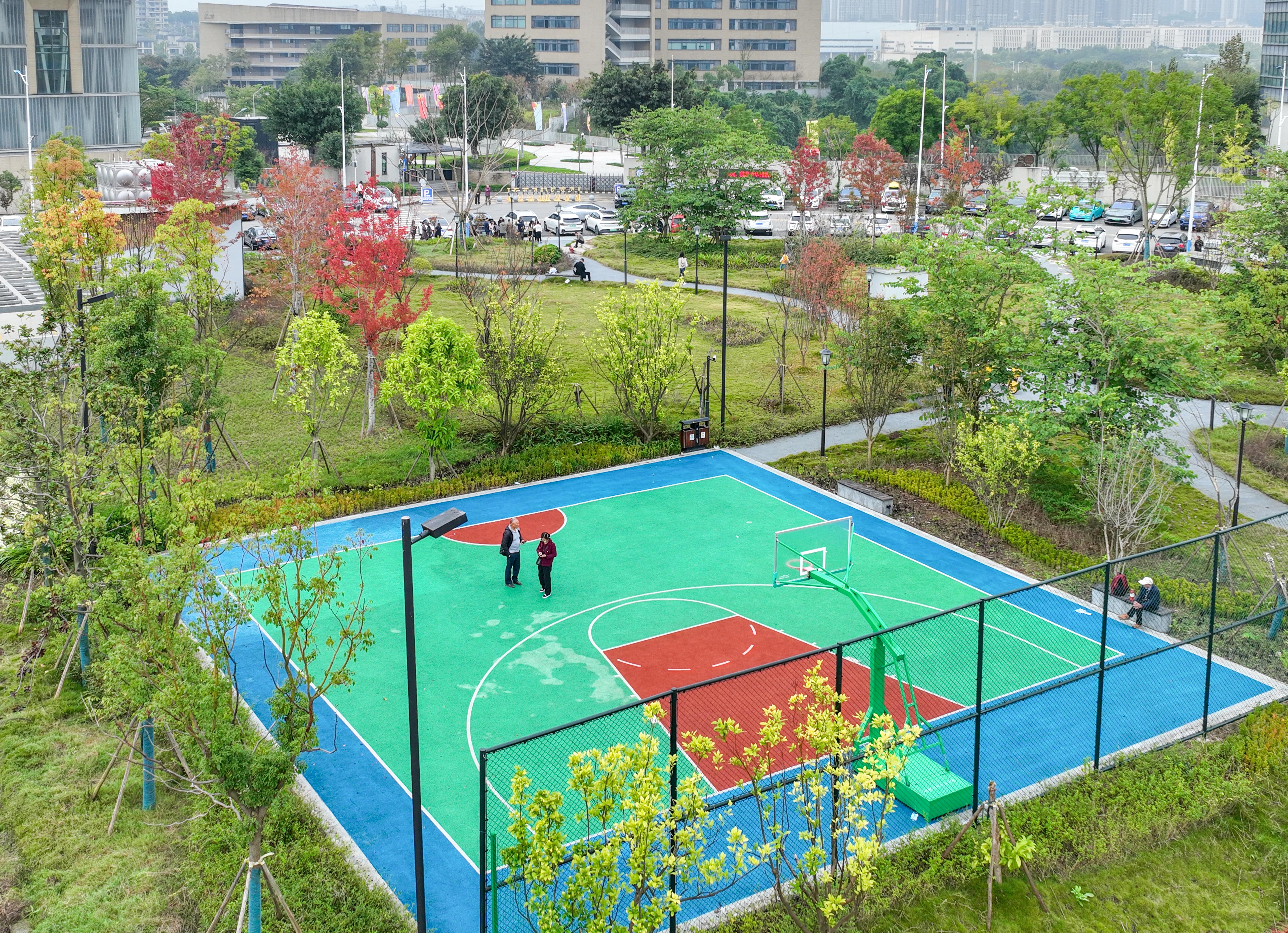 11月2日,两江新区水土新城西大附中水土校区2号门旁,全新的篮球场铺展在口袋公园的绿地上。该项目景观面积约4738㎡,配备了一个半场篮球场及地下停车场。记者 张锦辉 摄