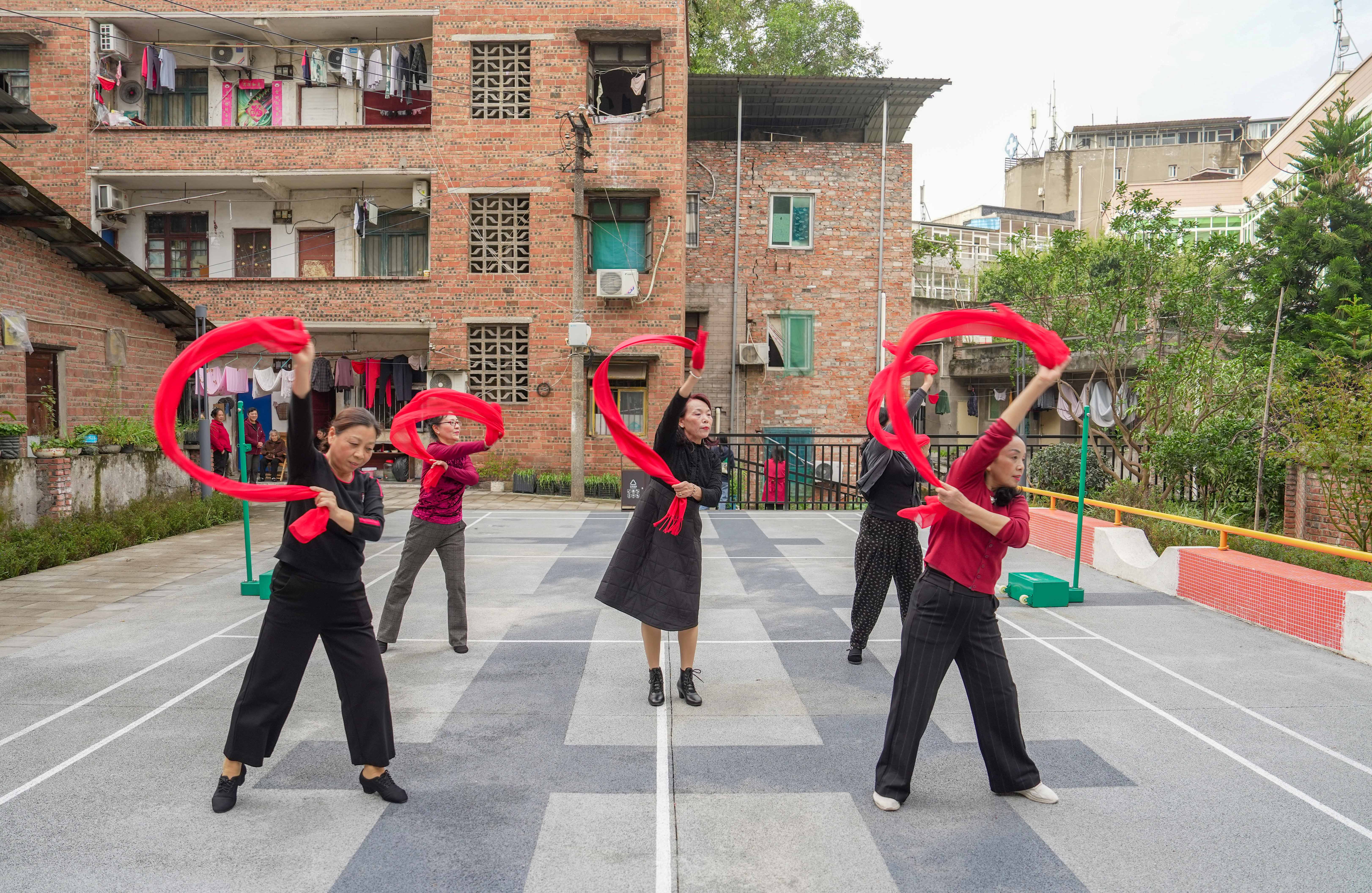 10月27日,重庆高新区白市驿镇驿路口袋公园,居民在崭新的羽毛球场排练舞蹈。该项目近日通过验收。记者 张锦辉 摄