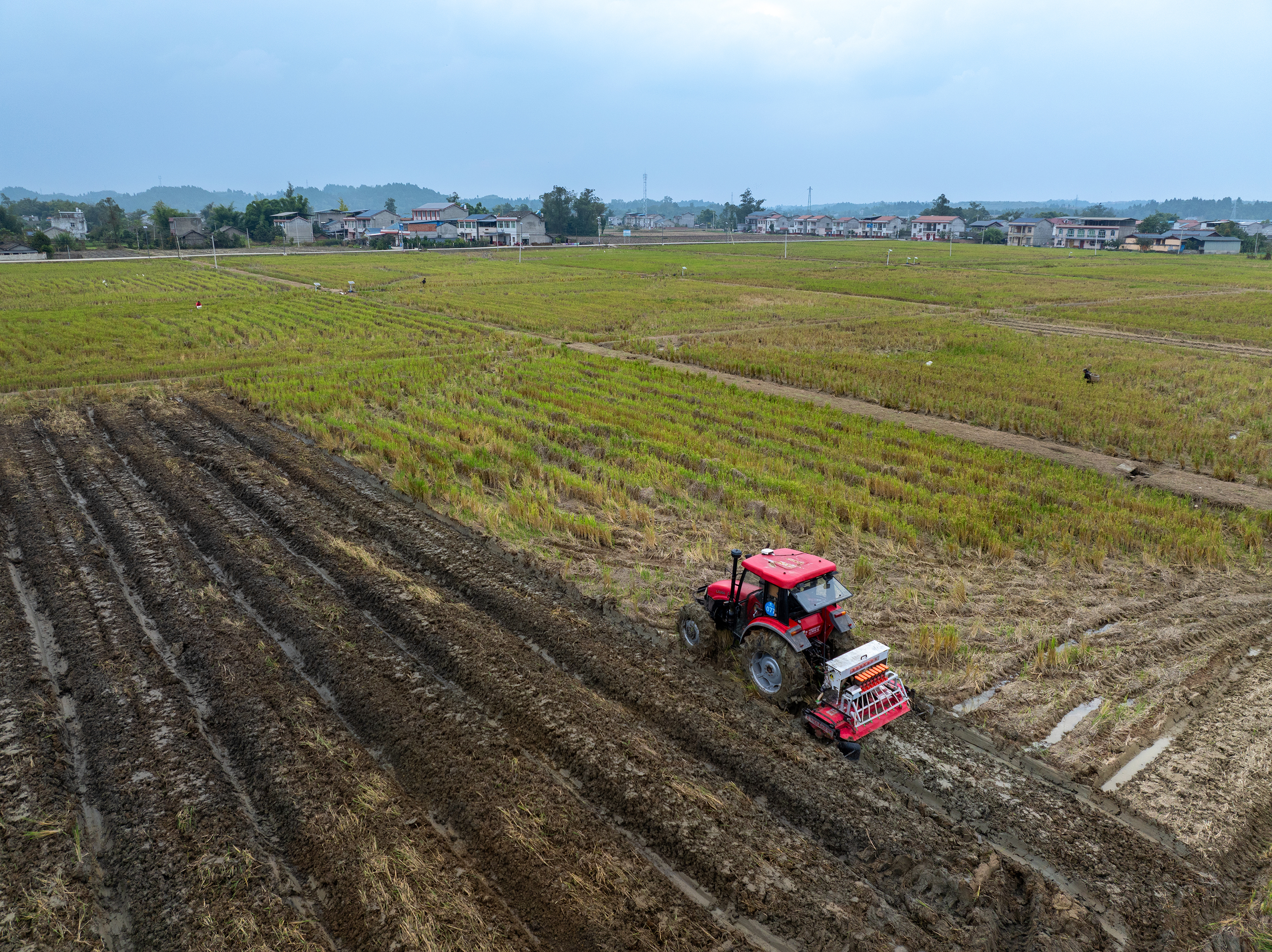 11月4日,潼南区桂林街道八角村重庆市现代种业创新基地稻油轮作试验田内,农机在播撒油菜种子(无人机照片)。记者 张春晓 摄