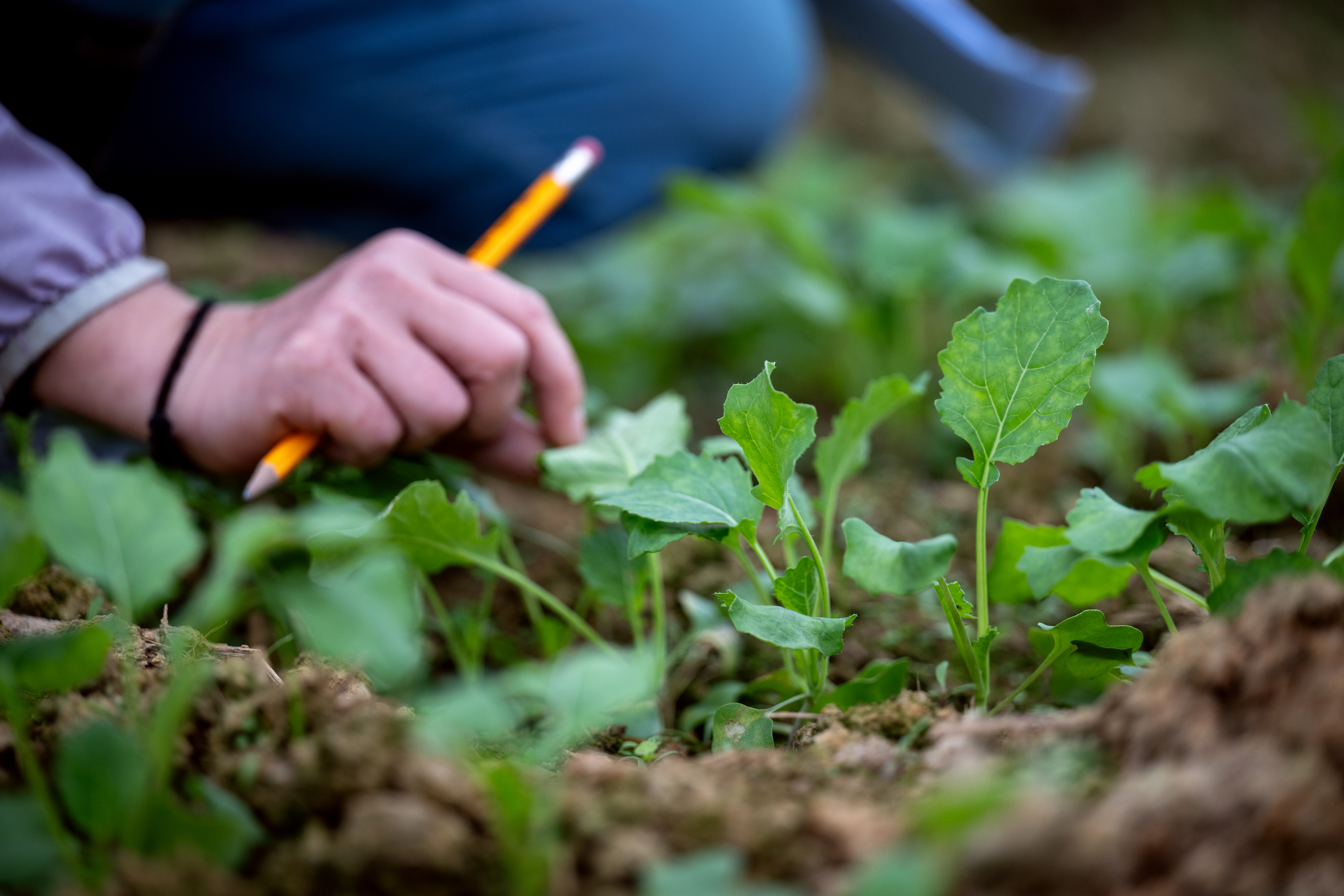 2025年11月4日,潼南区桂林街道八角村重庆市现代种业创新基地内,科研人员在查看油菜幼苗生长情况。记者 张春晓 摄