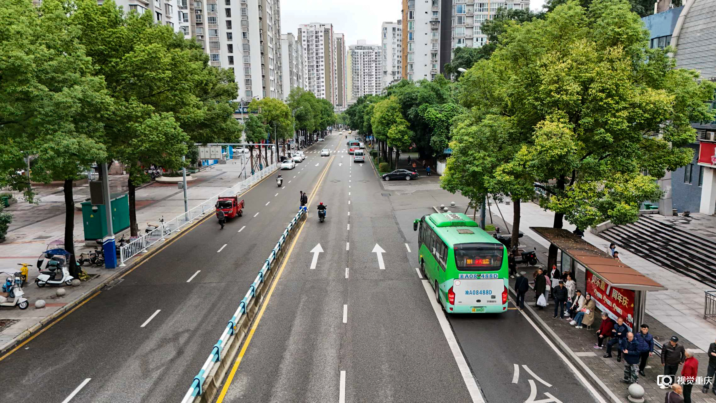 11月10日,首班从两江新区双凤桥枢纽站到北碚城南公交枢纽站的公交车行驶在路上(无人机照片)。记者 张春晓 摄
