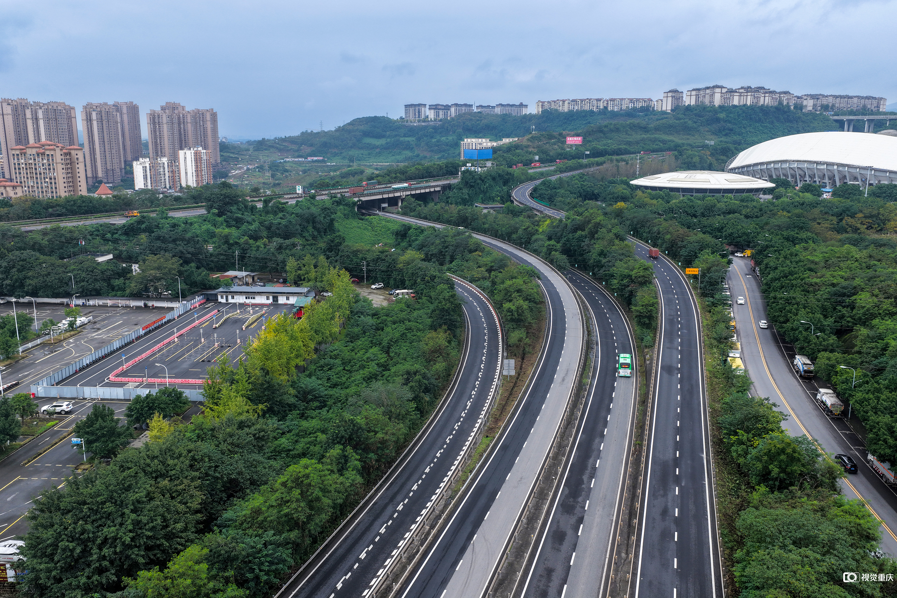 2025年11月10日,首班从两江新区双凤桥枢纽站到北碚城南公交枢纽站的公交车行驶在路上(无人机照片)。记者 张春晓 摄