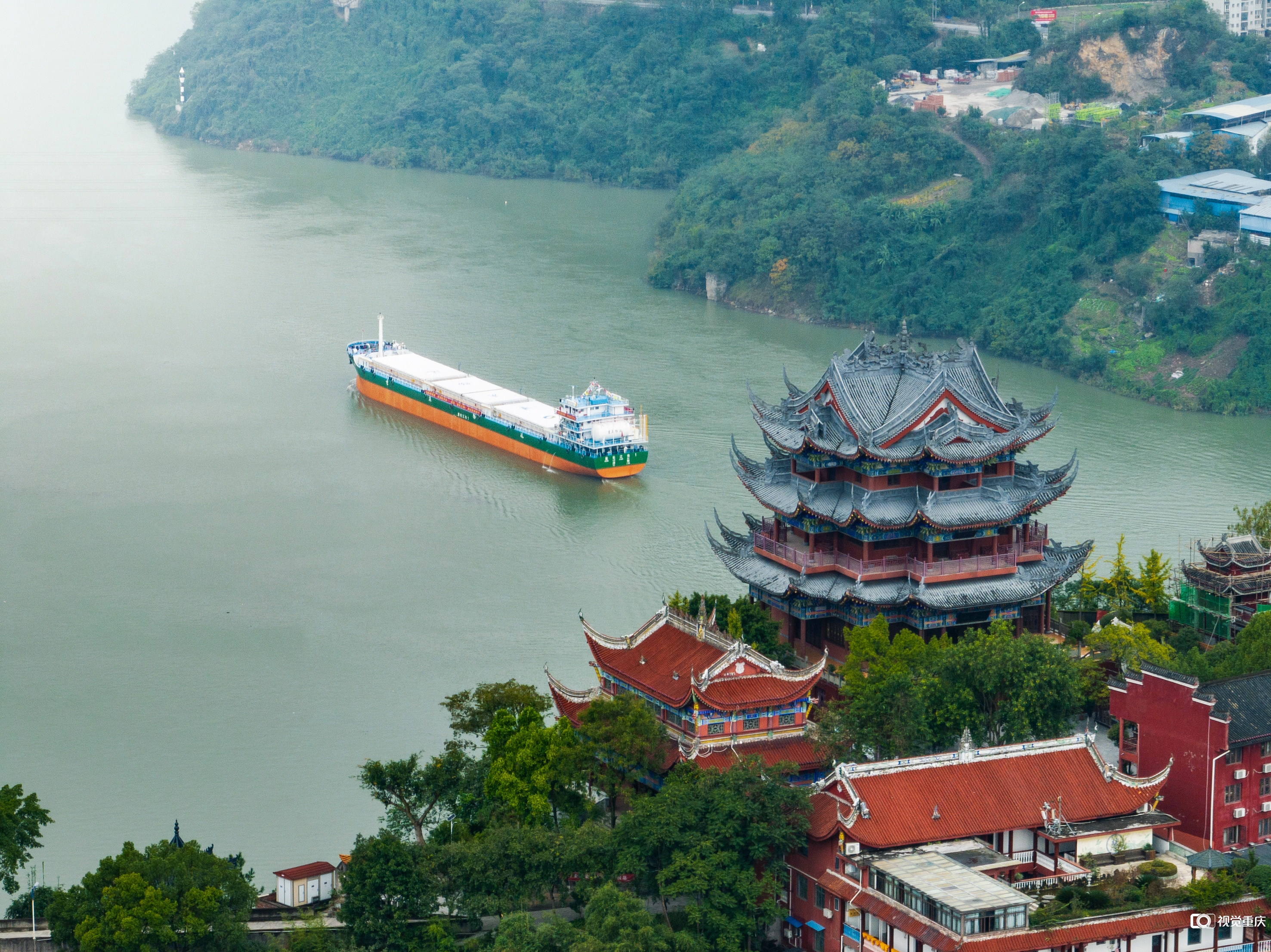 11月11日,涪陵区黄旗港,重庆市首艘130米LNG江海直达船“重轮江海1”驶离停靠的码头(无人机照片)。记者 张春晓 摄