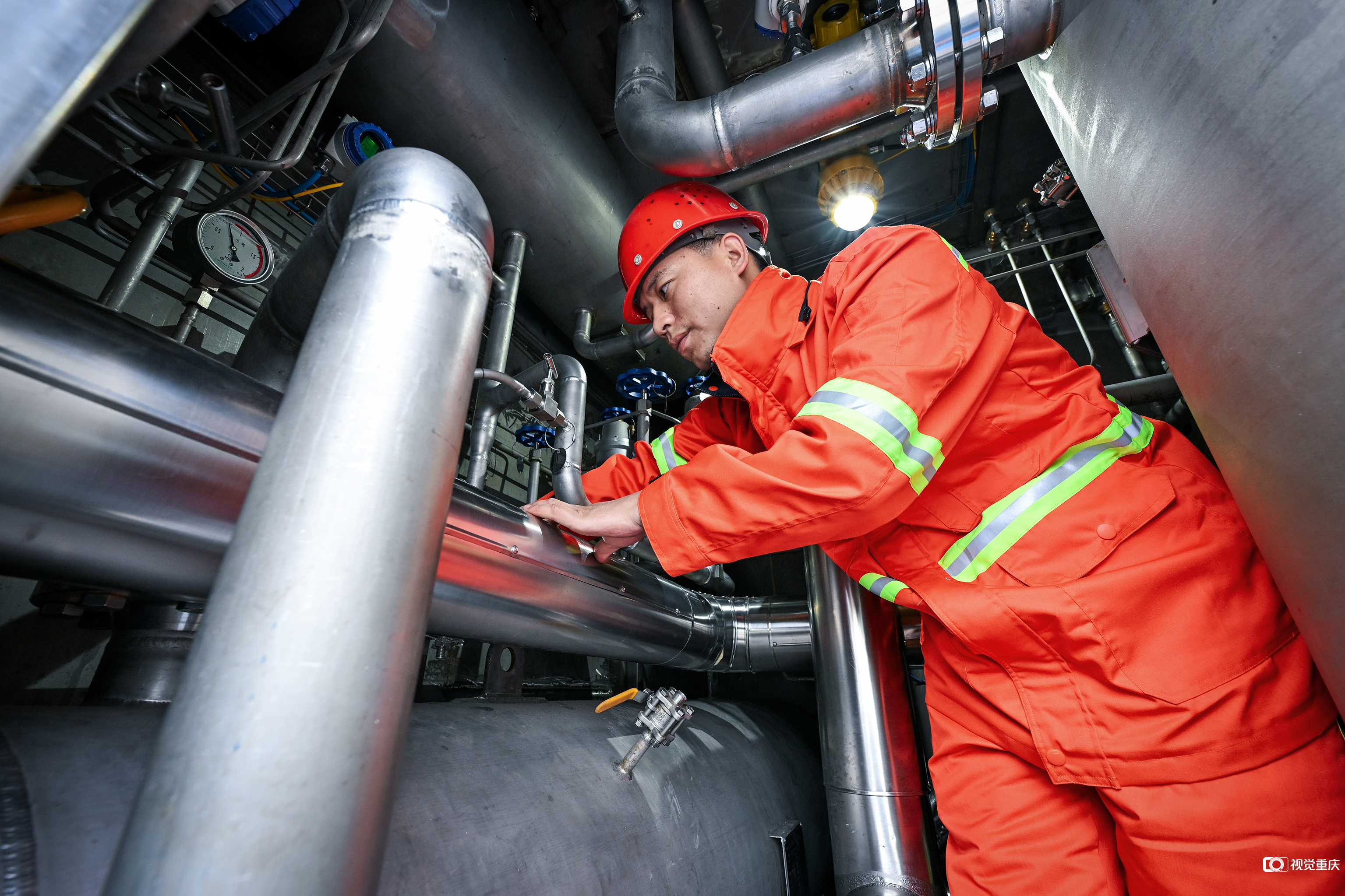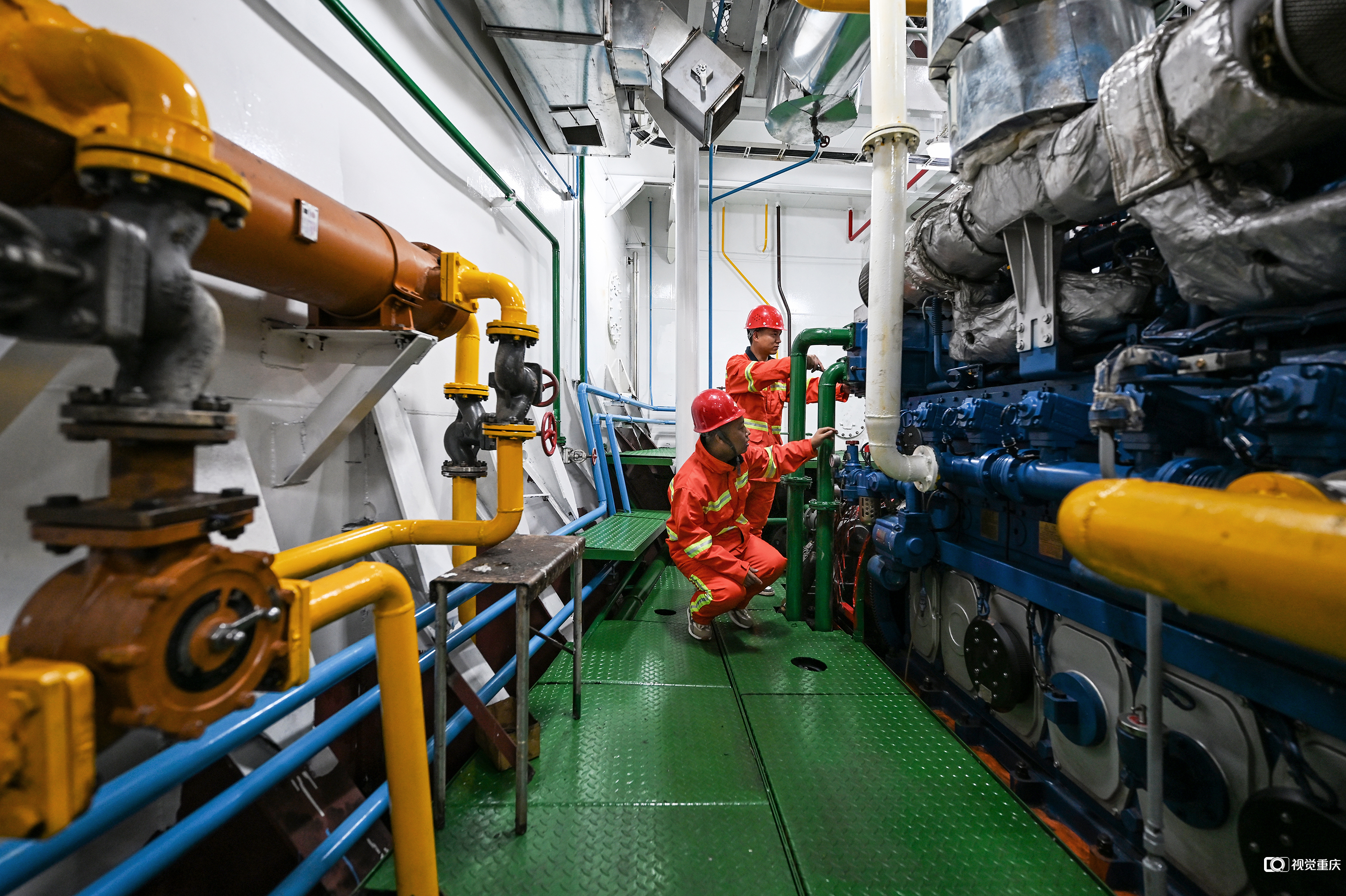 11月11日,涪陵区黄旗港,重庆市首艘130米LNG江海直达船“重轮江海1”首航前,工作人员在轮机舱检查设备状态。记者 张春晓 摄