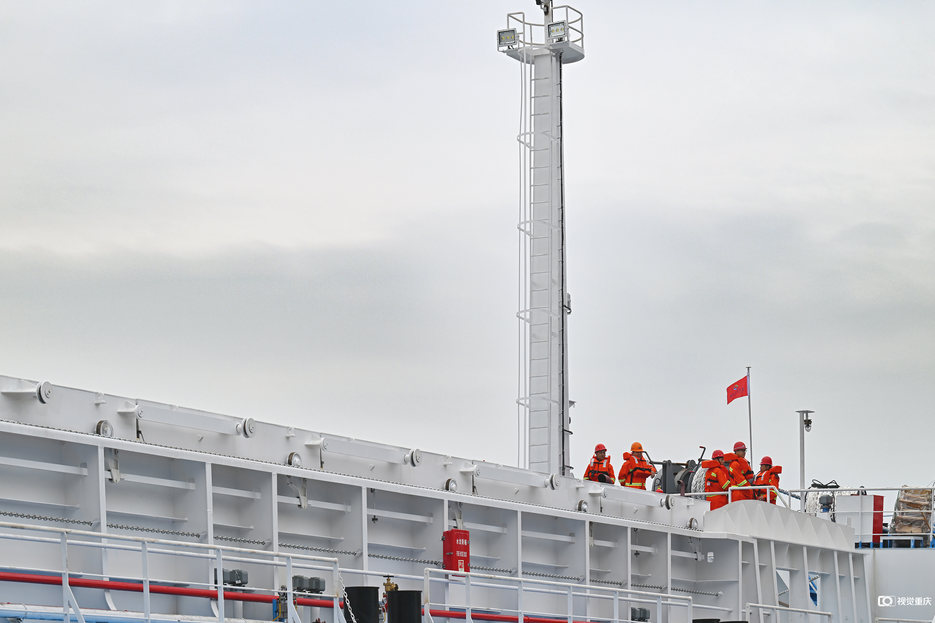 11月11日,涪陵区黄旗港,重庆市首艘130米LNG江海直达船“重轮江海1”首航前,工作人员在甲板上待命。记者 张春晓 摄