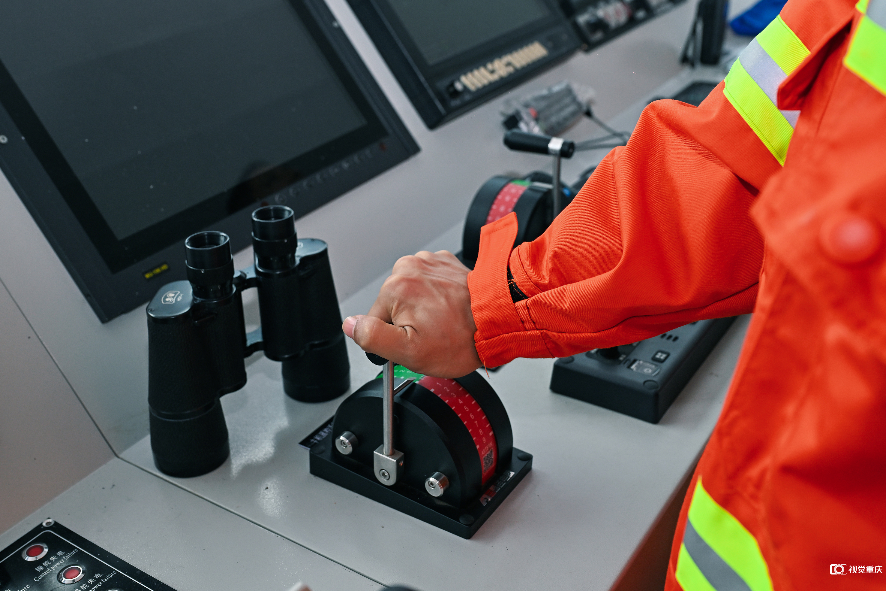 11月11日,涪陵区黄旗港,“重轮江海1”驾驶室内,工作人员启动船舶主机,驶离港口。记者 张春晓 摄