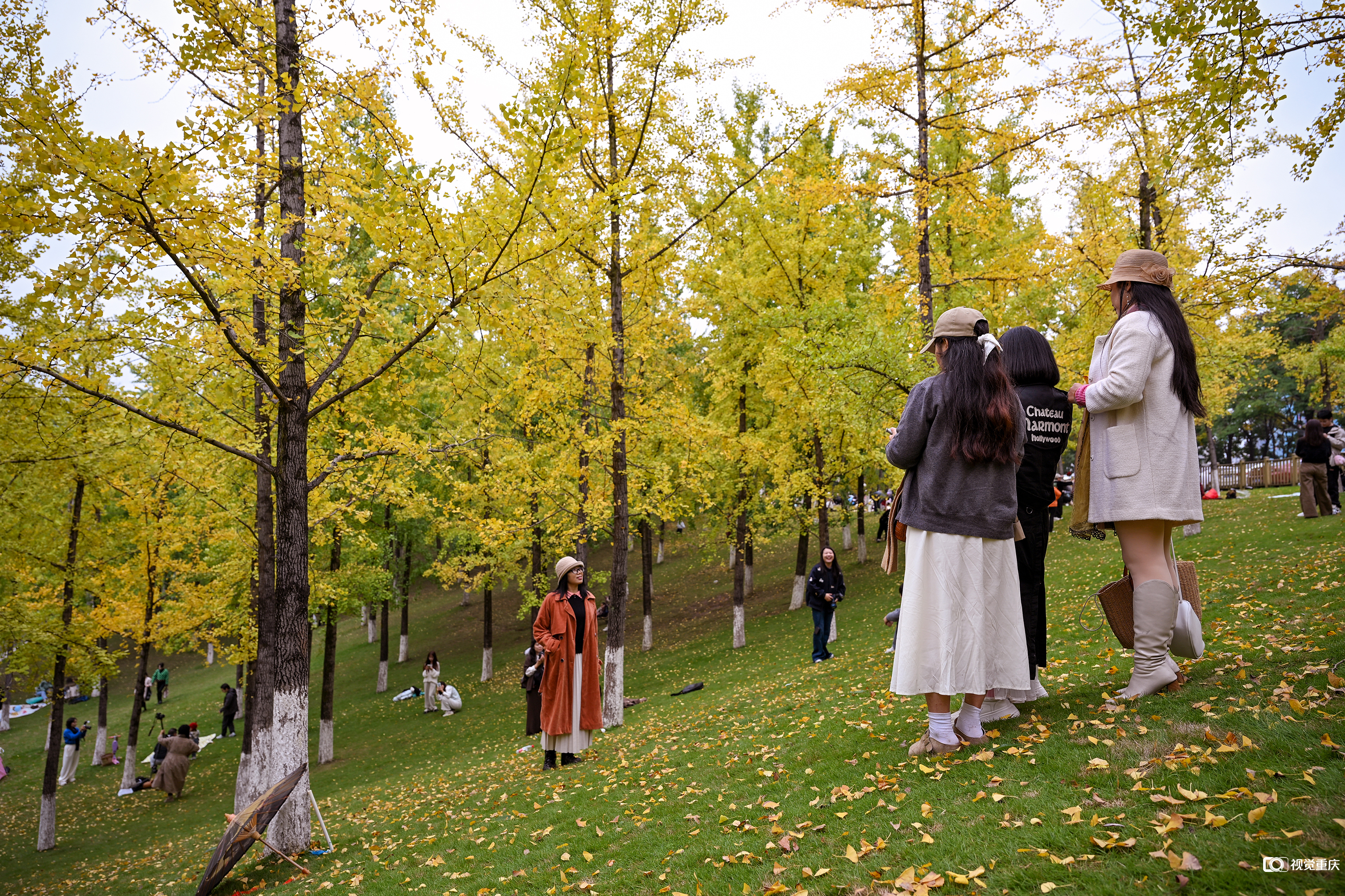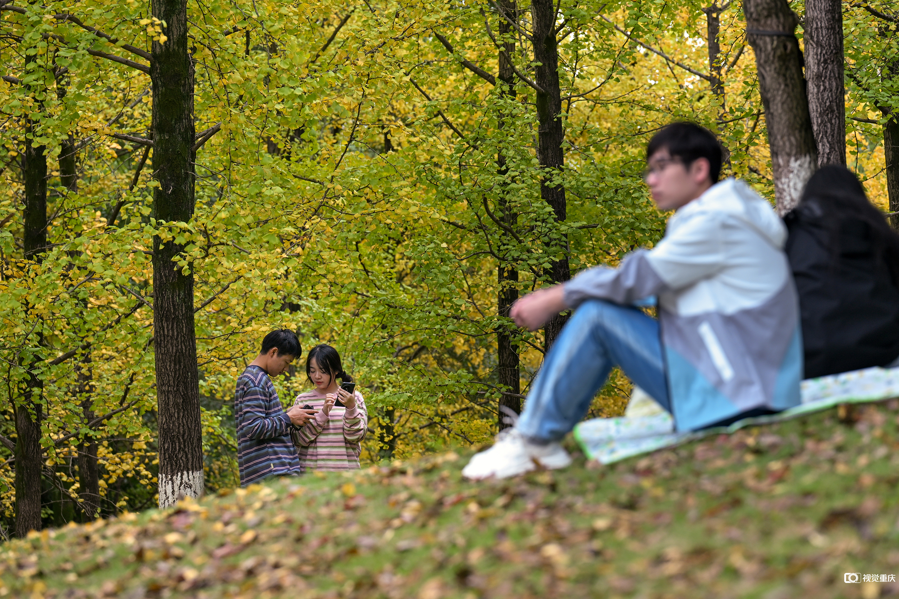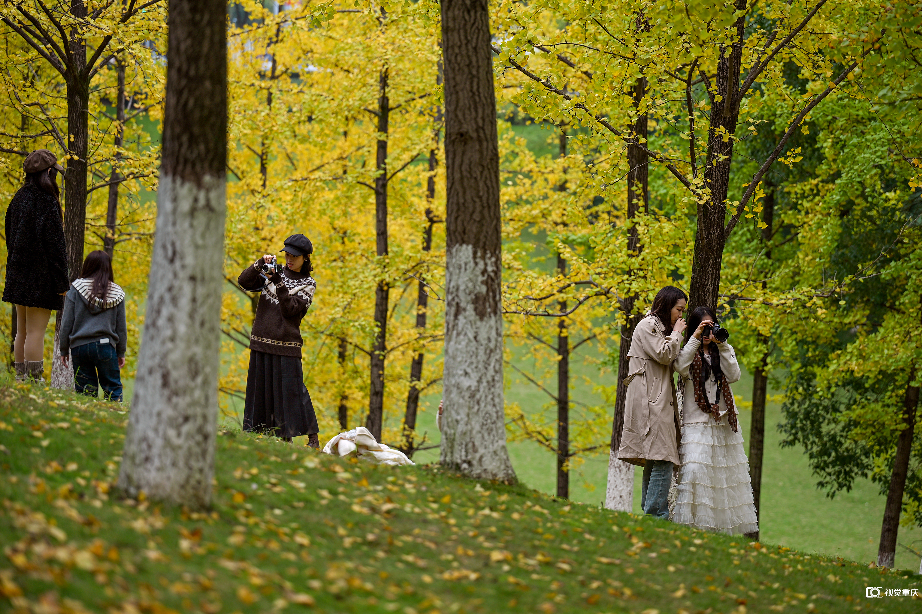 2025年11月15日,市民在两江新区中央公园欣赏冬天的黄叶,打卡留念。记者 张春晓 摄