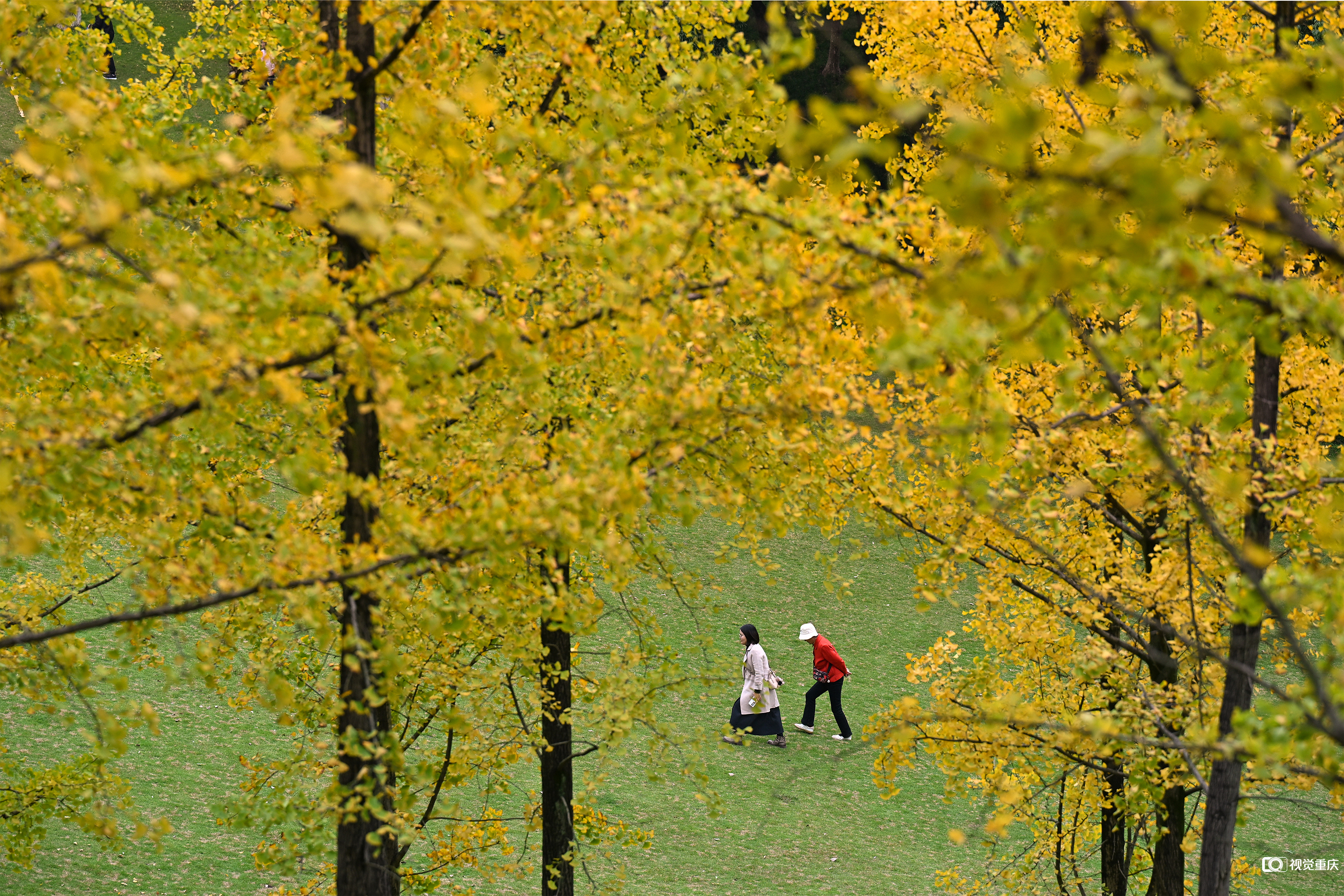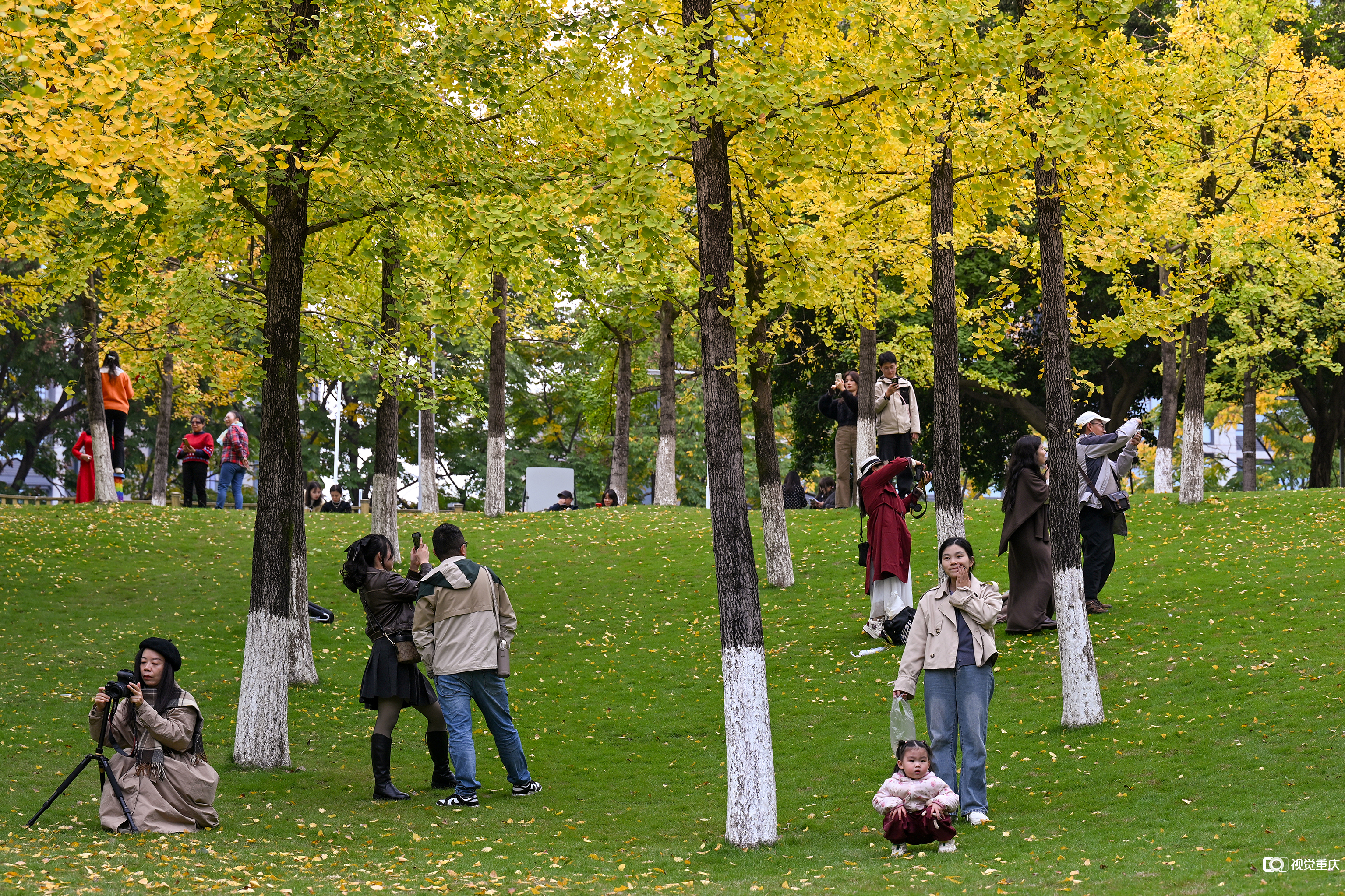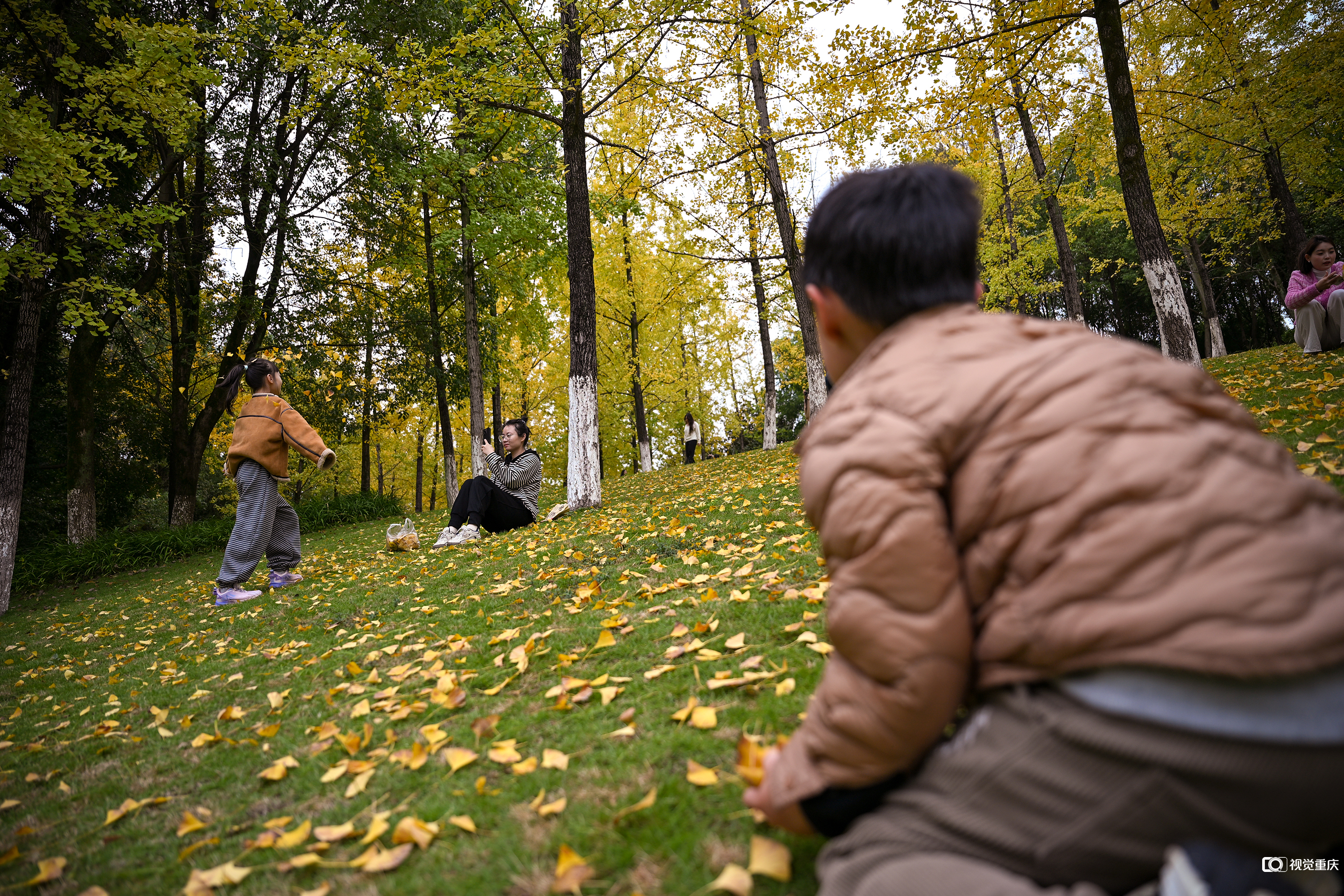 11月15日适逢周末,雨后天晴。两江新区中央公园内,成片树叶褪去绿意,披上灿烂金装,阳光透过摇曳的金色叶隙,为蜿蜒步道铺上耀眼的地毯。不少市民举家出游,或驻足拍照记录这限定冬色,或漫步林间享受周末闲暇。
