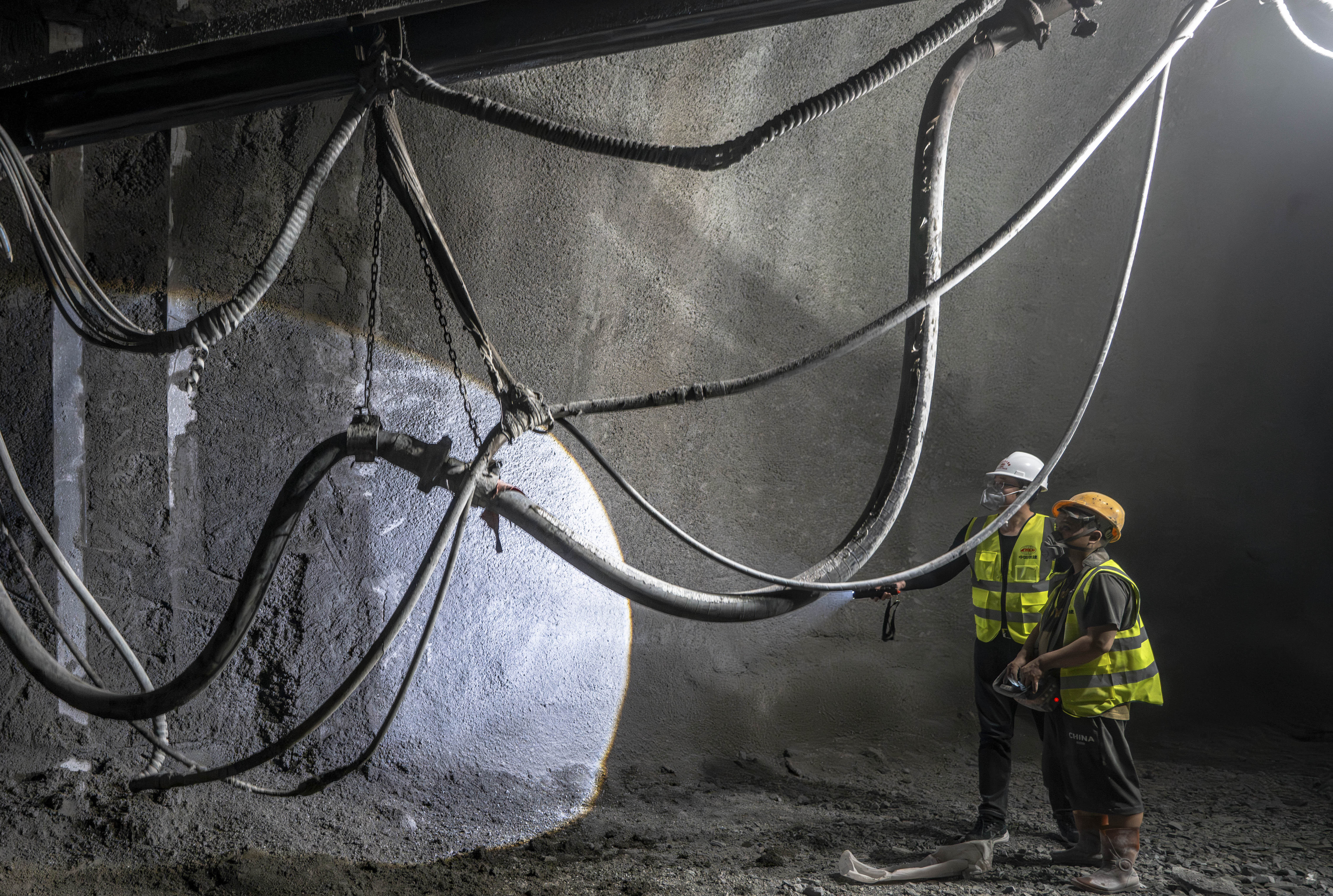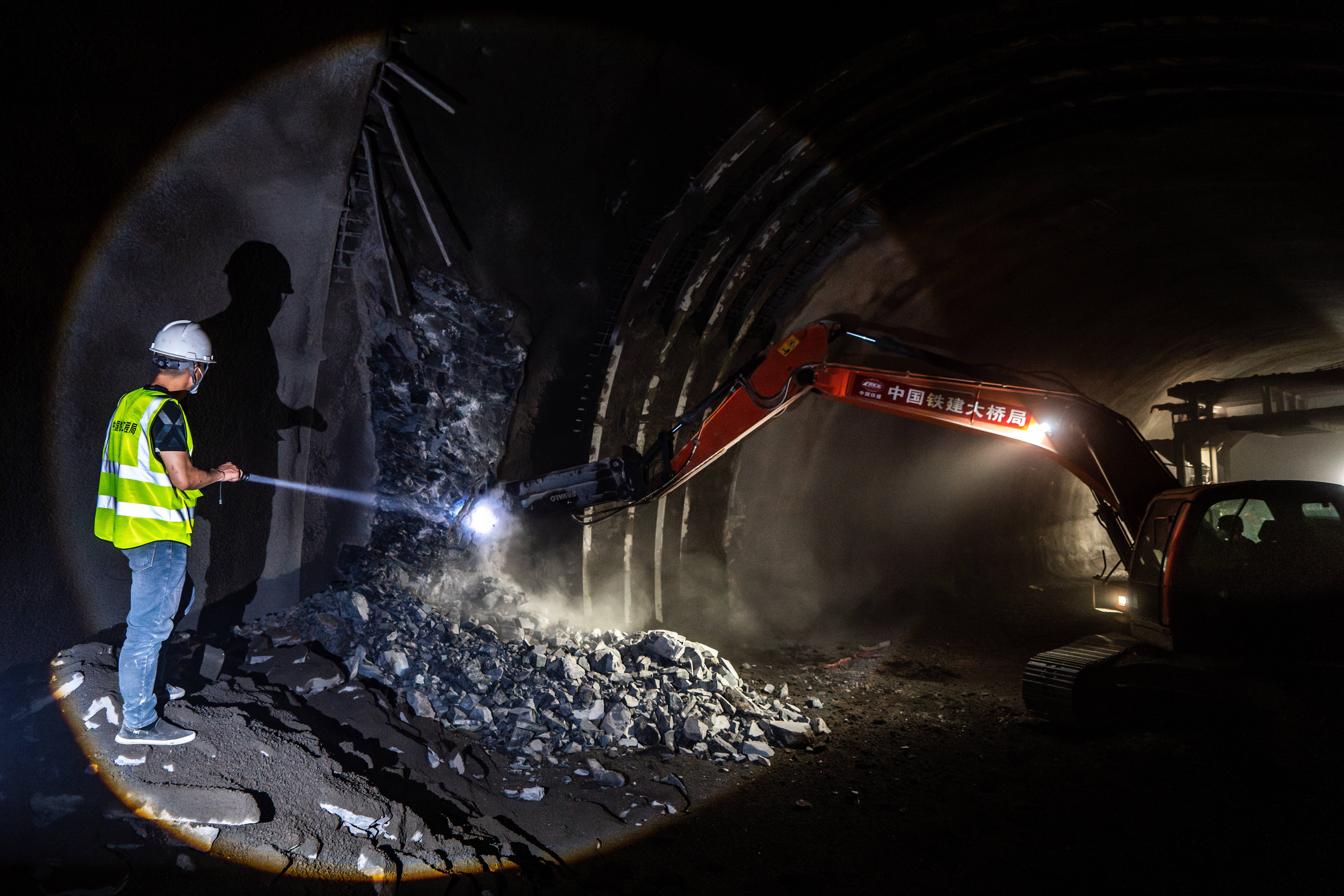 中国铁建大桥局的建设者在渝昆高铁彝良隧道内作业(12月9日摄)。新华社记者 胡超 摄