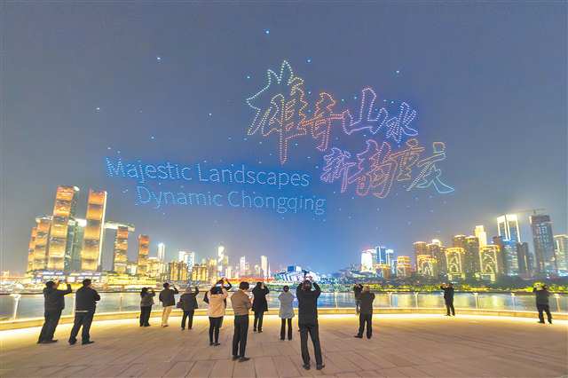 11月20日,重庆市规划展览馆,嘉宾们在欣赏精彩的无人机灯光秀。记者 李雨恒 摄/视觉重庆