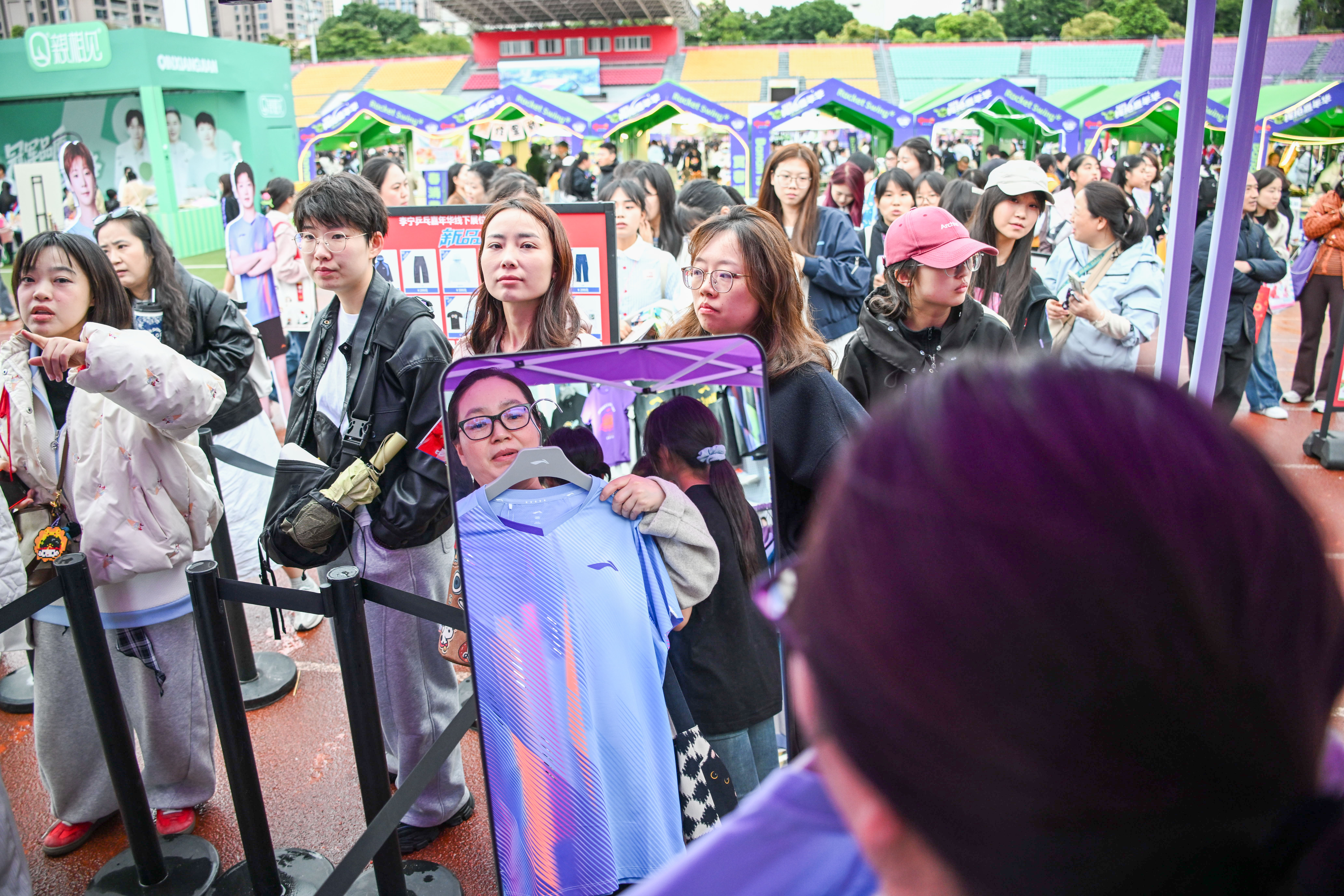 3月14日,重庆巴南华熙生物·润百颜ECM中心,球迷排队选购体育服饰。记者 谢智强 摄