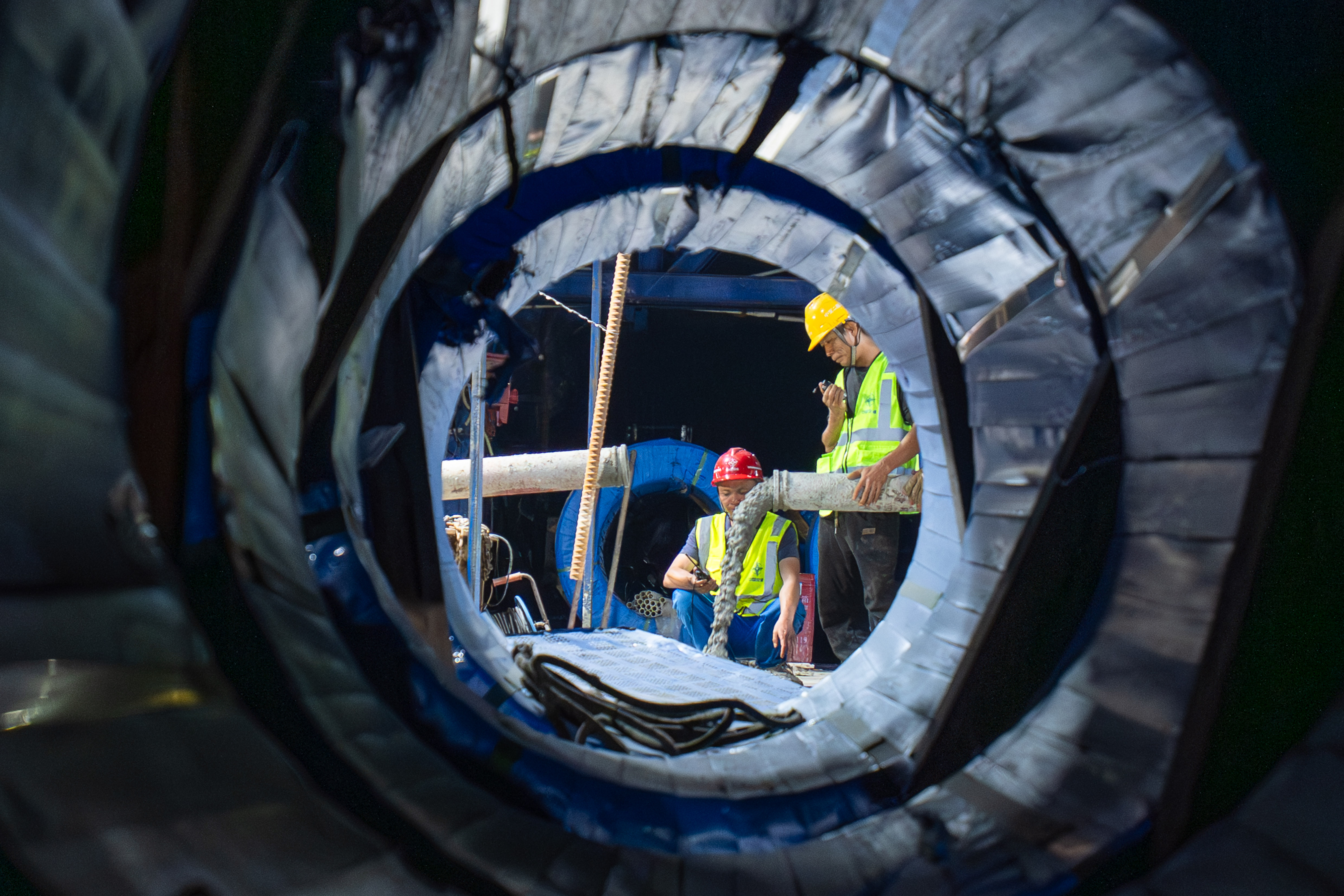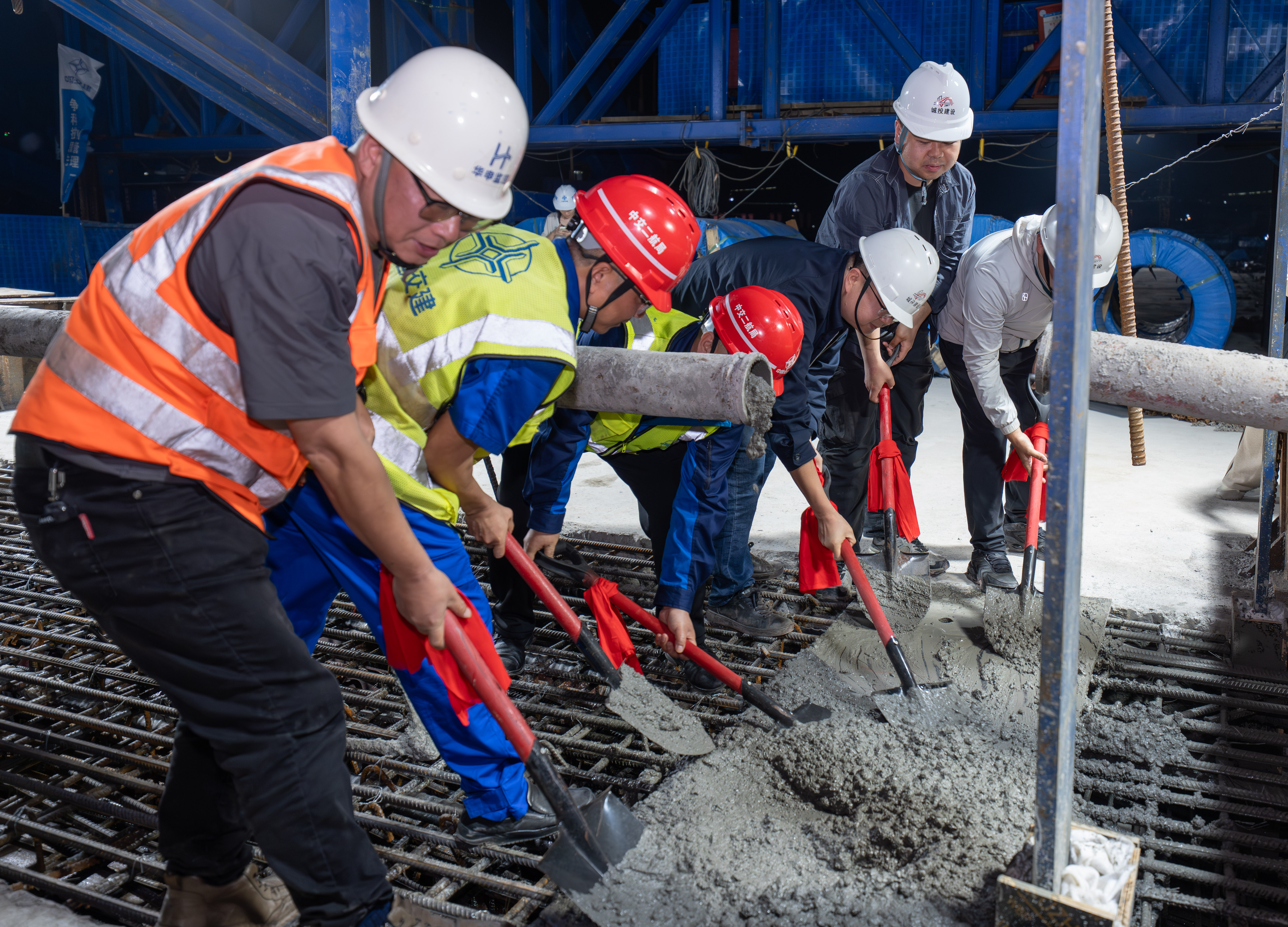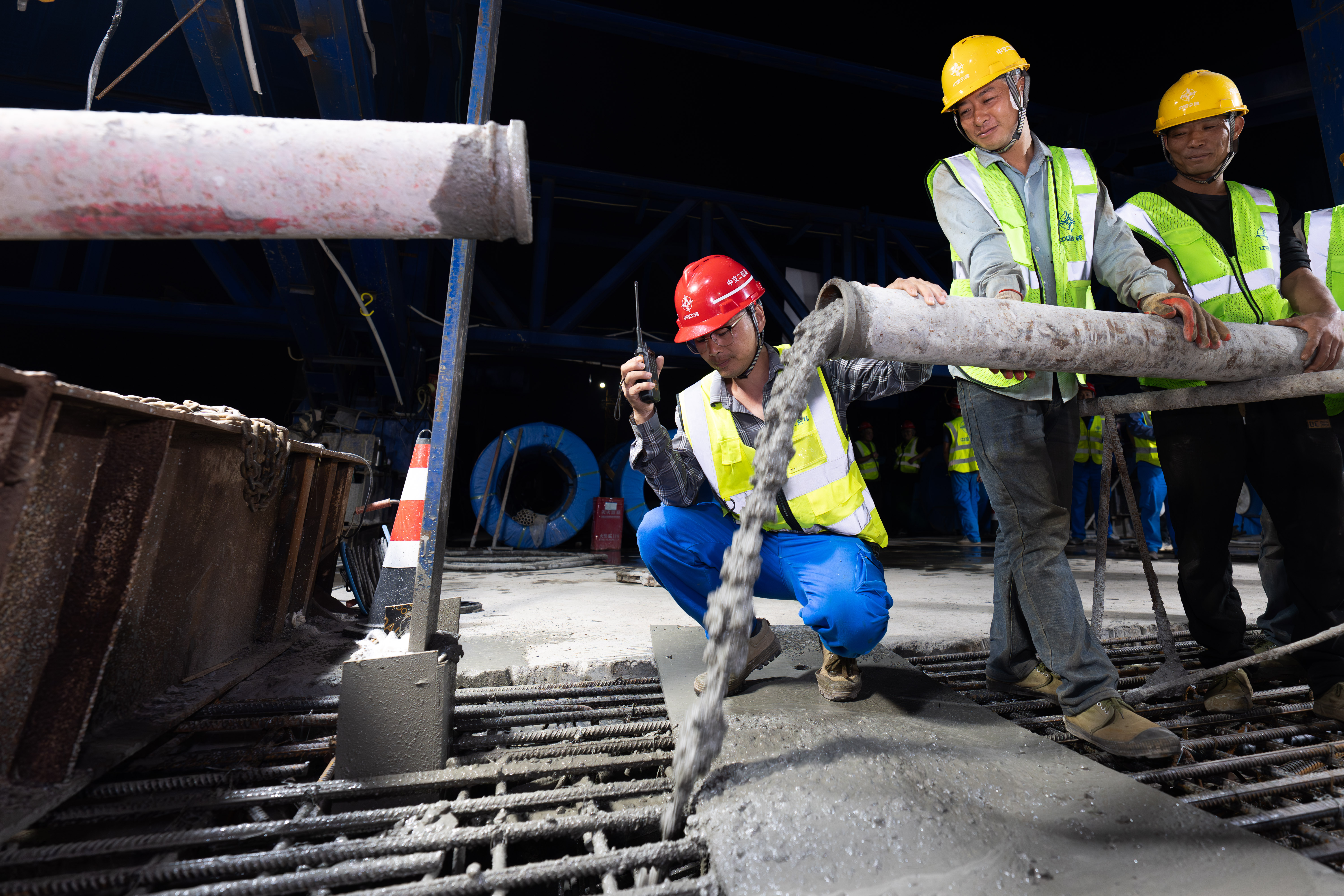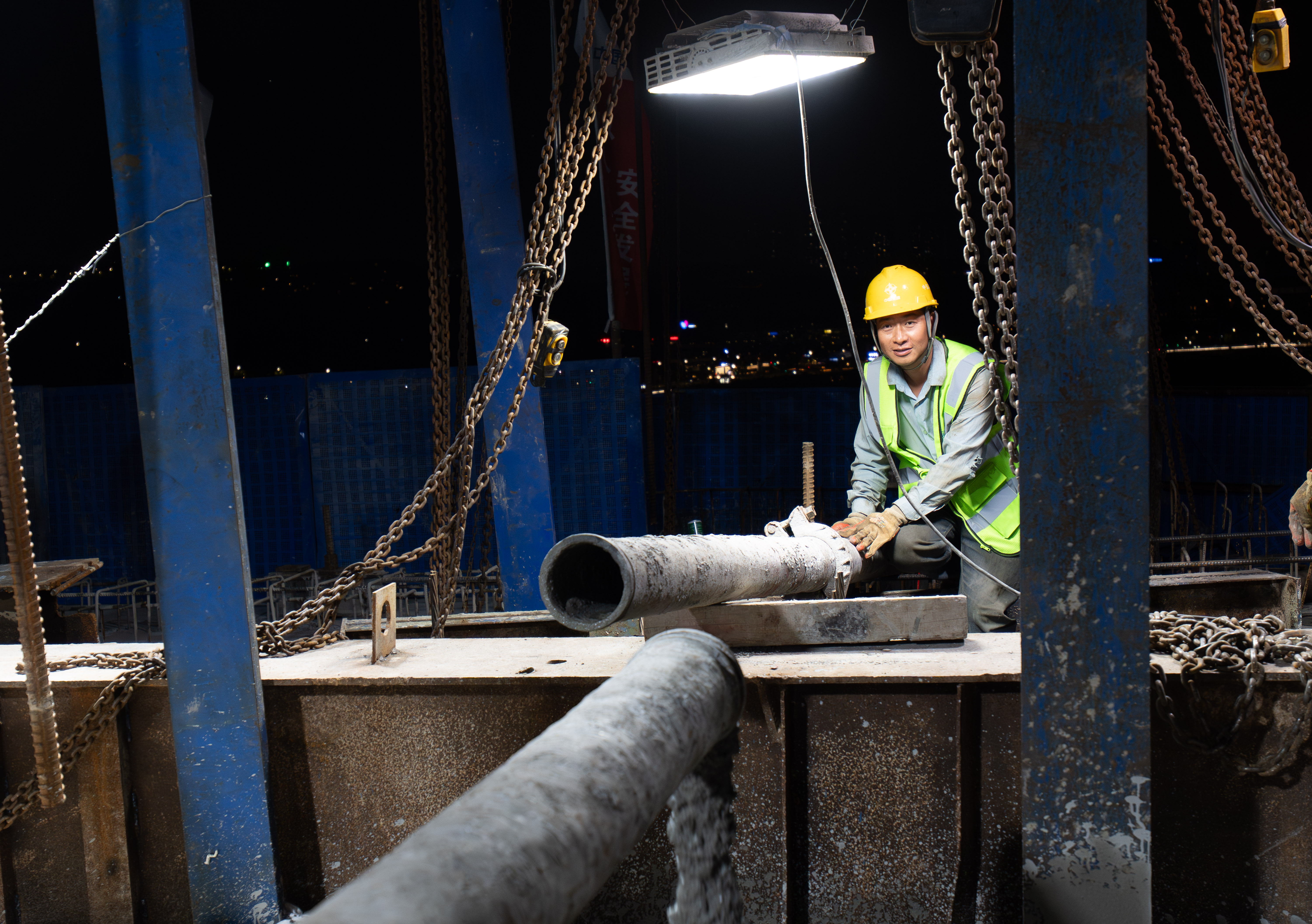 4月8日,宝山嘉陵江大桥施工现场,工人在进行混凝土浇筑作业。记者 李雨恒 摄