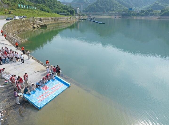 6月5日,乌江彭水万足段,万足镇中心校小学生、相关部门工作人员正在将鱼苗放流到乌江。(资料图片)特约摄影 赵勇