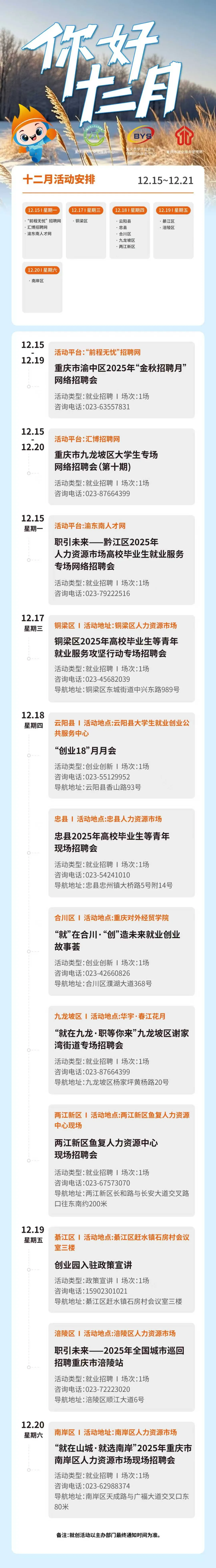 本周大学生就业创业活动来了,全市共12场大学生就业创业活动,其中,包括铜梁区2025年高校毕业生等青年就业服务攻坚行动专场招聘会、“创业18”月月会,覆盖求职、创业创新等活动。