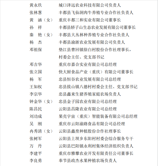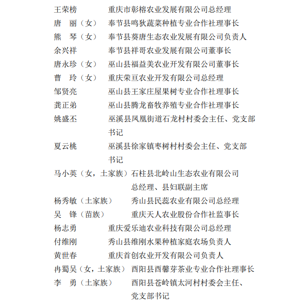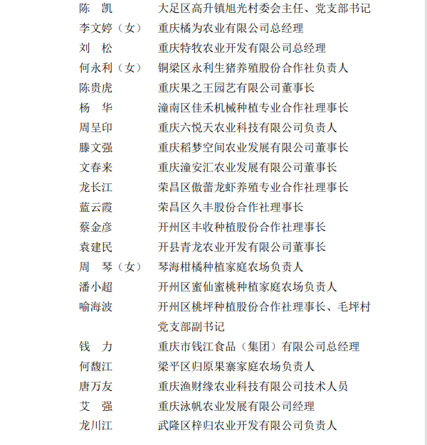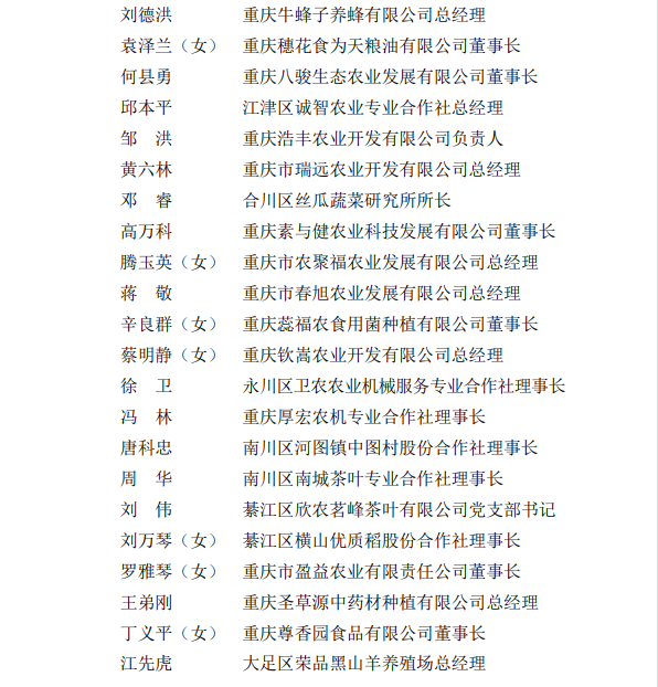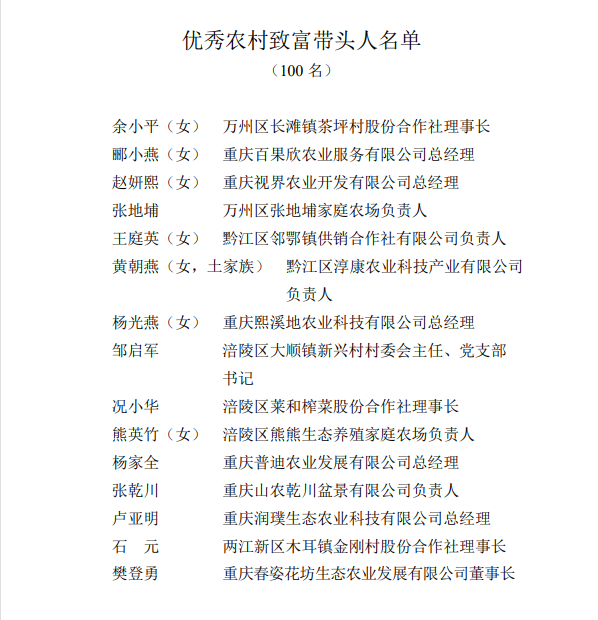 记者从市农业农村委获悉,为进一步发挥乡村人才示范引领带头作用,树立农业领域先进标杆,激励积极投身巴渝和美乡村建设、务实创业、联农带农作用突出的农村致富带头人,近日,市人力社保局、市农业农村委授予余小平等100名同志“优秀农村致富带头人”称号。