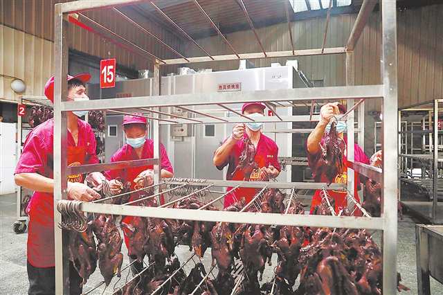 梁平真本味食品有限公司生产车间,工人将卤制后的张鸭子挂上烤架 摄/向成国