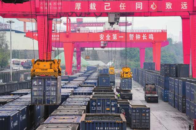 万州港红溪沟作业区,来自澳大利亚、巴西、南非等国的矿石在此转运,铁水联运一片繁忙 摄/黄建桦