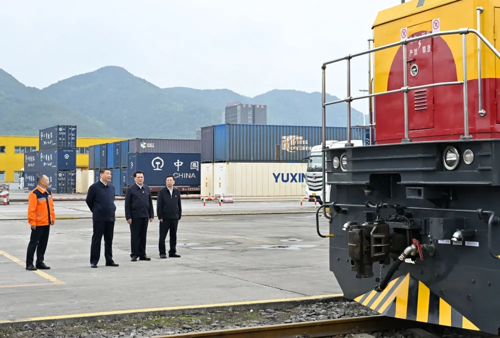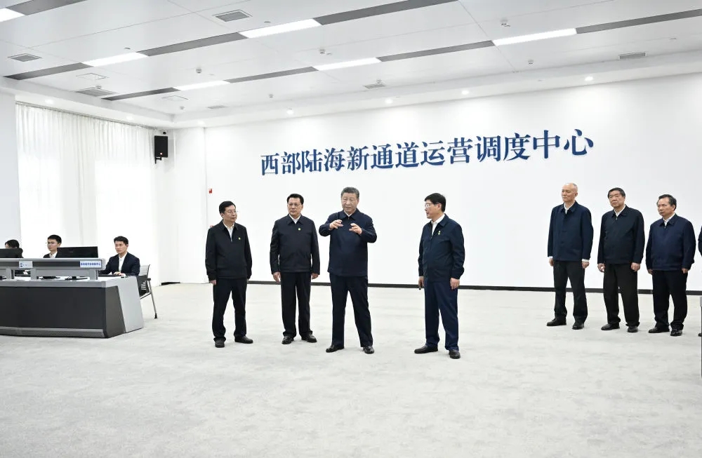 这是4月22日,习近平在重庆国际物流枢纽园区,了解当地加快建设西部陆海新通道等情况。