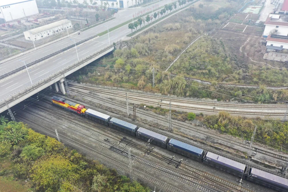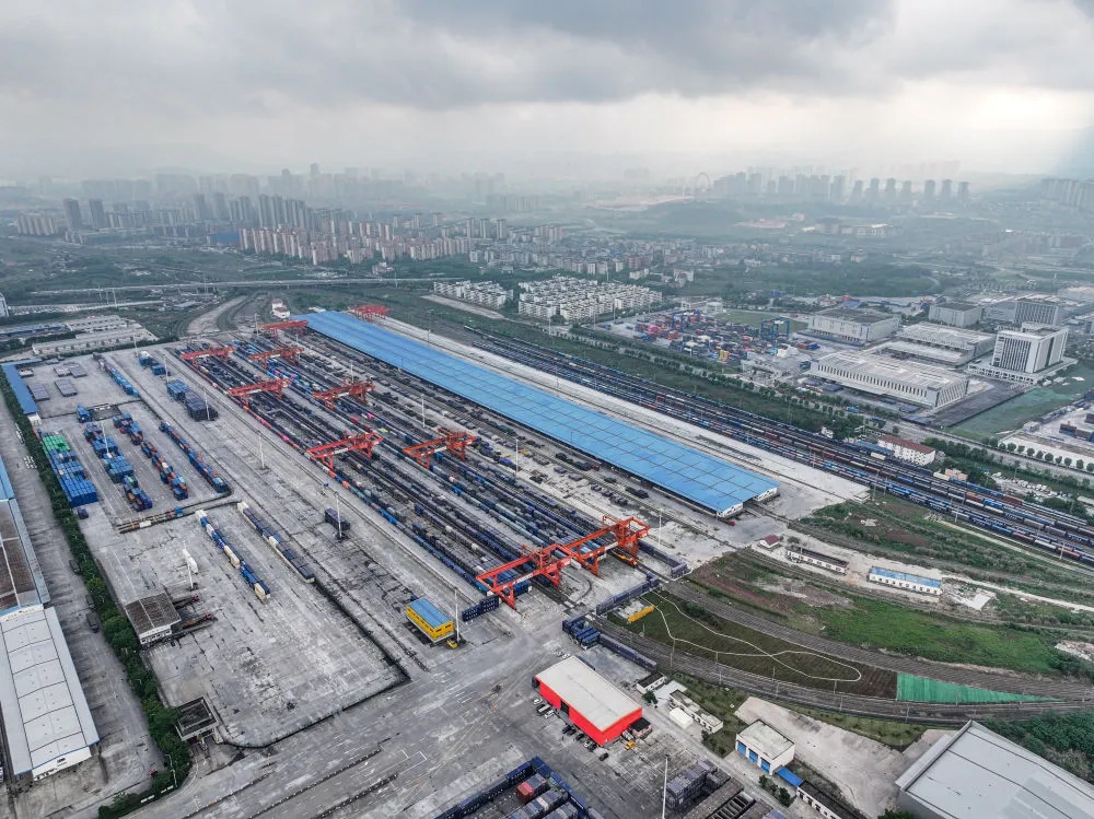自重庆国际物流枢纽园区向北,一列列满载货物的中欧班列经新疆霍尔果斯口岸出境,联结起区域开放发展之路。