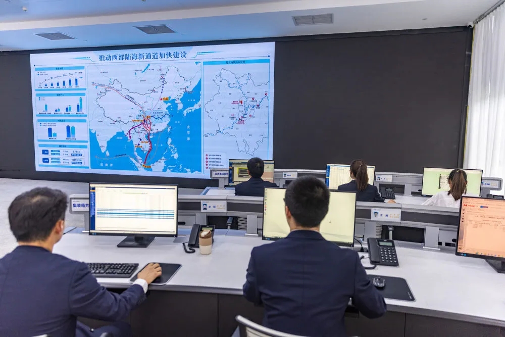 2024年4月22日,工作人员在西部陆海新通道运营调度中心工作。工作人员可以在大屏上实时了解班列在边境口岸的出入境信息。