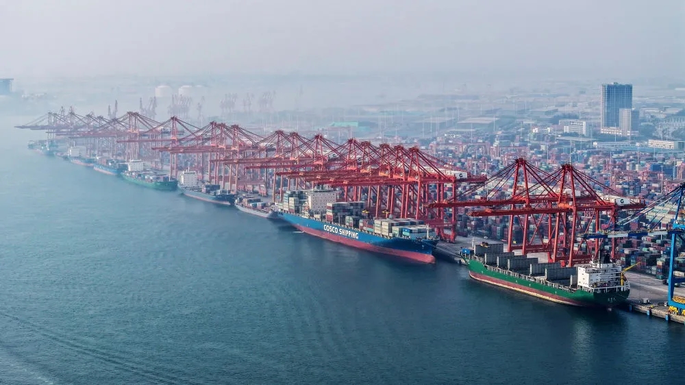 2024年3月28日,在广西钦州港码头,多艘海轮在排队卸货(无人机照片)。据统计,截至3月29日,今年西部陆海新通道铁海联运班列运输集装箱货物20.03万标箱,同比增长7.2%。