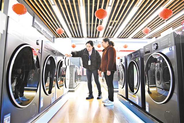 2月7日,垫江县一商场,市民正在咨询和选购洗衣机,以旧换新惠民政策与春节促销活动共同点燃了消费市场。(重庆日报资料图片)特约摄影 孙凯芳/视觉重庆