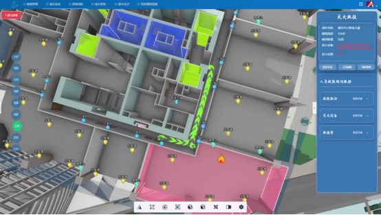 火情确定后,系统可向受困人员智能推送着火层最优逃生通道,并向消防救援人员推送着火层最优救援通道与灭火设备。同时,还可向受困人员、救援人员推送楼栋内纵向的逃生通道、救援通道以及避难层等信息,实现“防灾精准到户、救援精准到人”,为高层建筑防火救援智理体系建设提供参考。值得注意的是,推送的线路和通道都以三维模型图景呈现,让受困人员和救援人员对逃生救援线路清晰可辨。