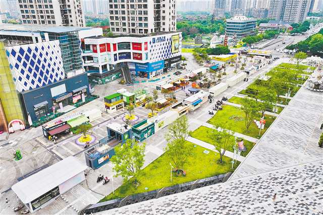 这里曾是一片闲置区域。此前,有市民曾在“民呼我为”平台反映,此处车辆乱停乱放,压坏路面,既不安全又影响城市美观。二郎街道通过政企合作模式,推动闲置地块“变身”成为PulsePod云嘻街商业街区,不仅设置了休闲座椅,还增设了美食店、时尚零售店、宠物生活馆等,为市民提供消费新场景。