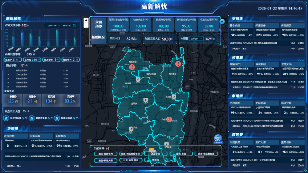 “以前群众诉求信息分散在不同的平台,缺乏对高频事件的研判分析和整体概览,导致治理响应滞后、靶向施策不足。”重庆高新区政务服务和社会事务中心(以下简称“政务中心”)相关负责人一边展示“高新解忧”综合场景,一边说道:“我们聚焦群众呼声‘最大公约数’分析提炼出高频共性事件,推动诉求高频事件、防灾减灾风险隐患、网络安全隐患‘三个全量上平台’,群众身边事全量入库、高频共性事件有序纳管,实现群众诉求响应率100%。”