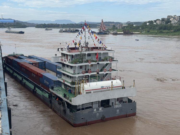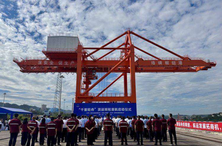 7月25日上午,在重庆江津珞璜港集装箱码头,随着离泊汽笛响起,一艘装载着36标箱复合材料和一艘装载着123标箱货物的千吨级集装箱货船离港启航,分别驶向万州新田港和云南水富港。与此同时,“涪陵白涛港—云南水富港”“开州港—万州新田港”航线同步发航,以上4条航线同步启运,标志着重庆“千里轻舟”货运班轮正式开行。