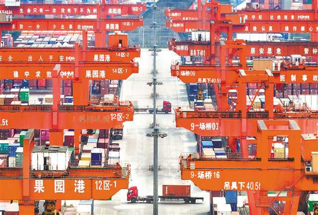 目前果园港建成18个5000吨级泊位、14条铁路专用线,年货物吞吐量超2600万吨,通达全球100多个国家和地区的300多个港口,是全国首个“双四星”认证内河港口。