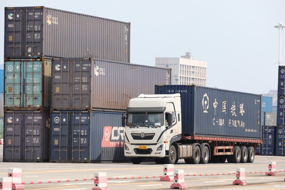 7月22日,在位于沙坪坝区的铁路团结村中心站,转运卡车正在运输集装箱。特约摄影 孙凯芳