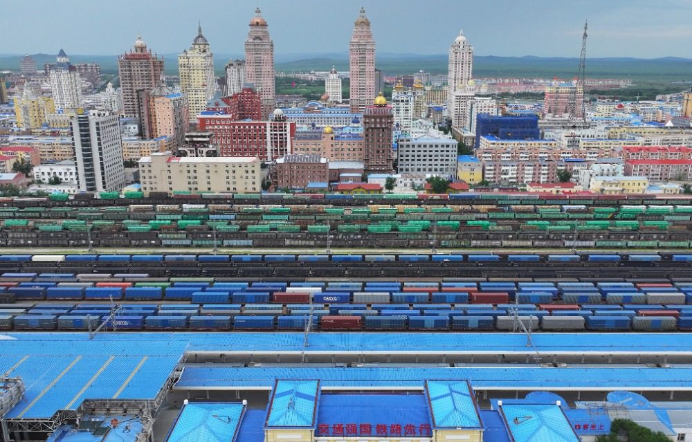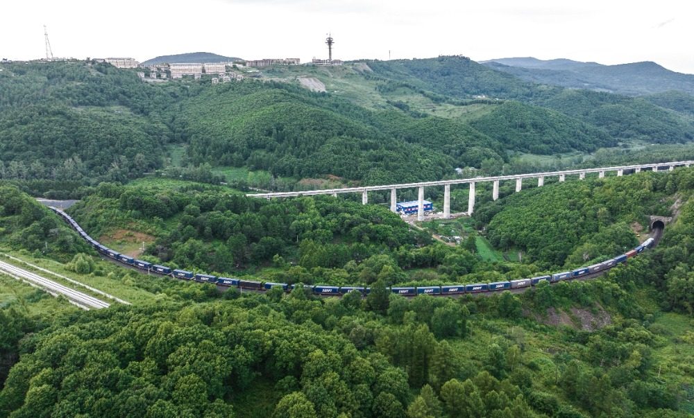 7月21日,一列满载家用电器的中欧班列驶出中国铁路哈尔滨局集团有限公司绥芬河站(无人机照片)。新华社发(曲艺伟摄)