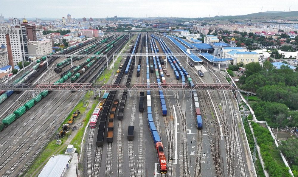 7月22日,一列满载货物的回程中欧班列在中国铁路哈尔滨局集团有限公司满洲里站准轨西场等待发车(无人机照片)。新华社发(黄旭摄)