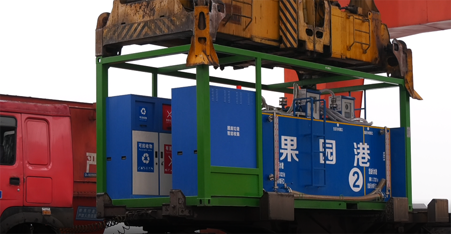果园港内的船舶污染物移动接收箱。新华网发(受访者供图)