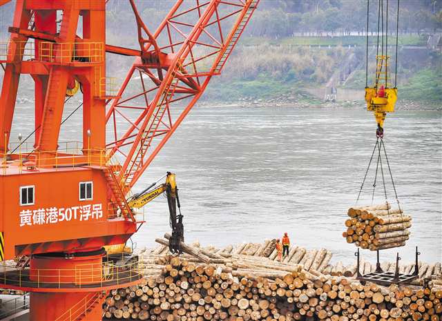 近日,九龙坡区黄磏港投入运营,首艘进港货轮装载5000吨新西兰进口原木。图为工人正在卸货。