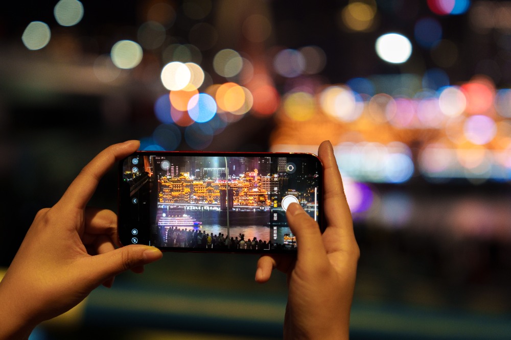 10月4日,江北区江北嘴,游客用手机记录重庆的美丽夜景。记者 李雨恒 摄