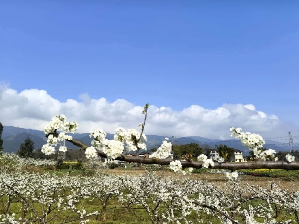 成片李树沿山坡层层铺展,洁白花朵缀满枝头,嫩黄花蕊点缀,花香清甜。远眺如白色花海,与青山、农舍相映,治愈感拉满。
