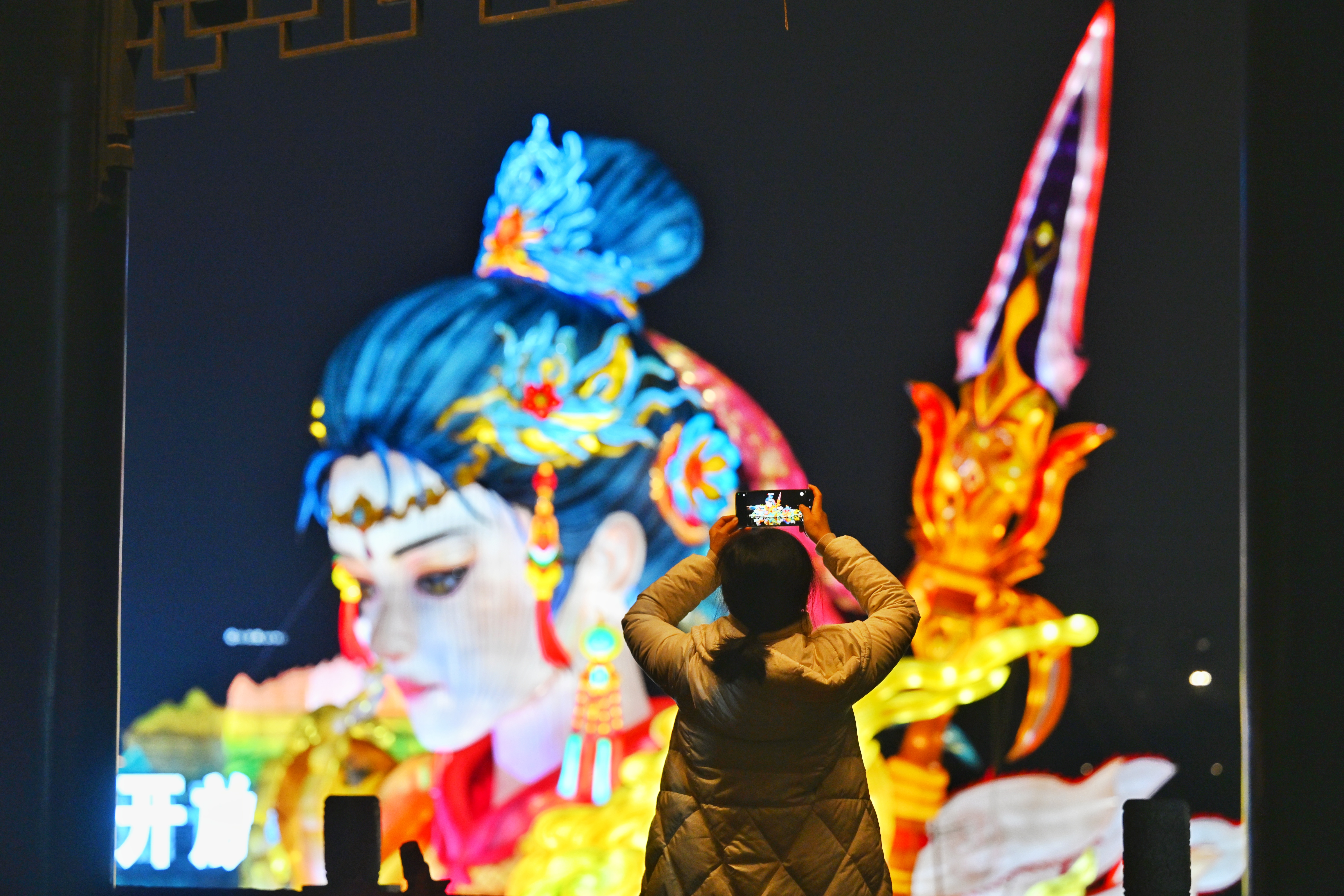 《巾帼良玉》灯组,长约40米、高约15米,以巾帼英雄秦良玉为原型。“秦良玉”凤冠华美,战甲披金,白杆枪凌厉生辉;身旁战马欲奔、旌旗如焰,叙说着“巾帼不让须眉”的传奇。