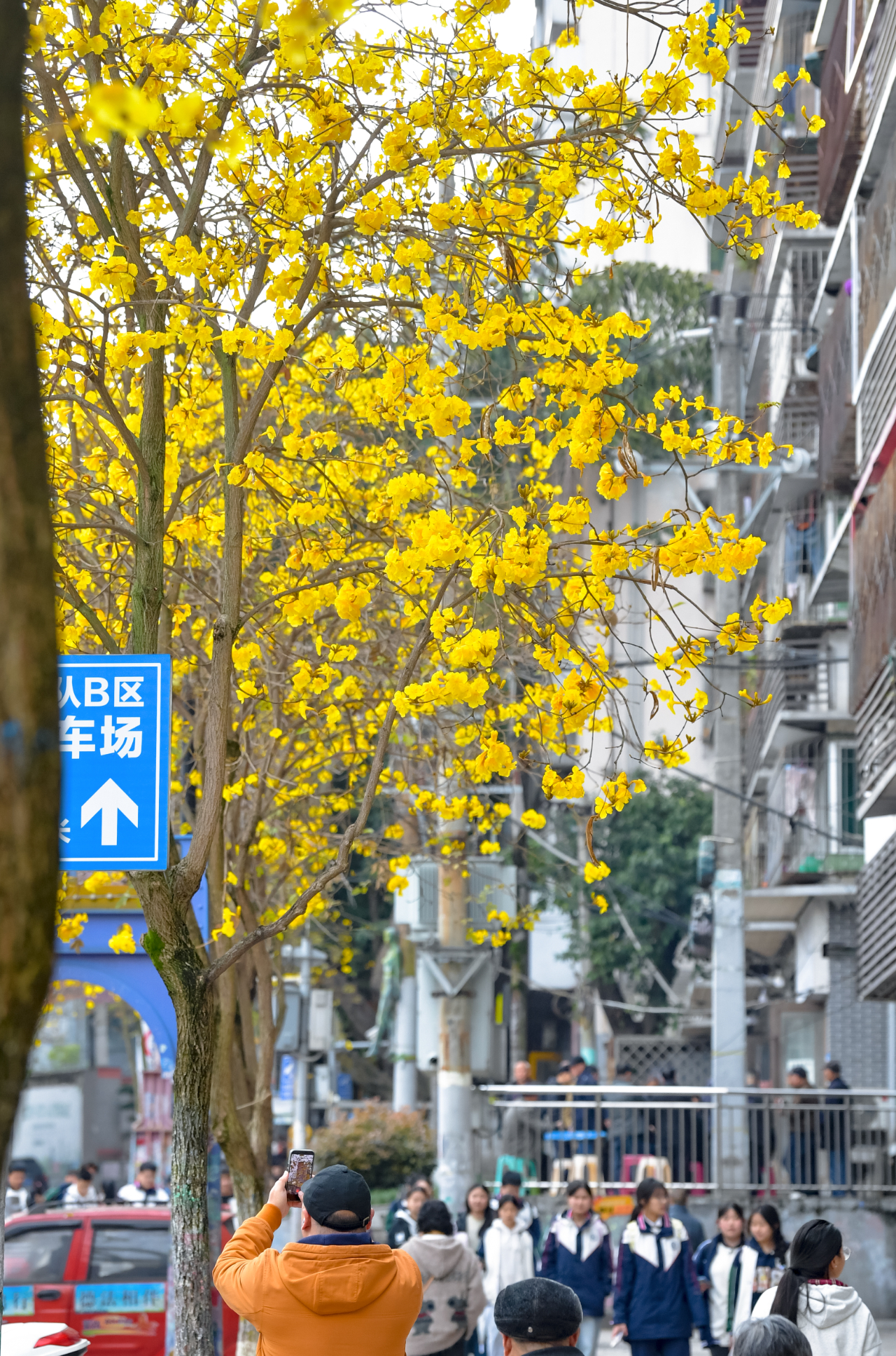 黄花风铃木在春日里呈现出“花多叶少”,甚至“只见花不见叶”的独特景观,硕大的花朵仿佛一个个明亮的小灯笼将整条街道装点得暖意融融。